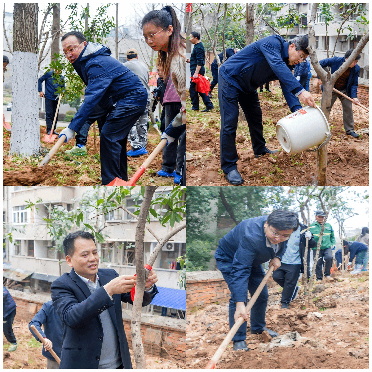 校领导挥锹铲土、扶苗填坑、培土浇水