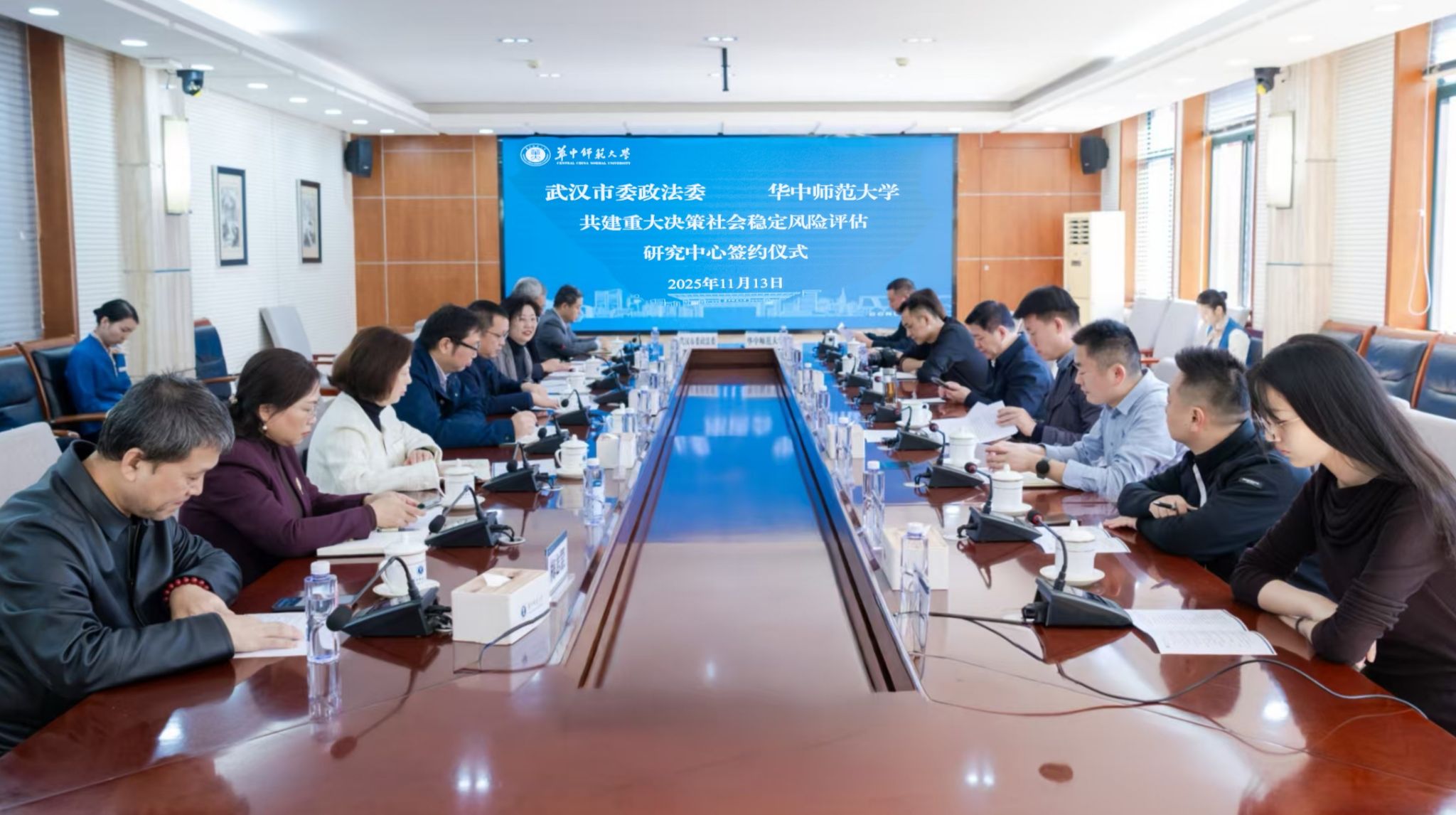 华大在线讯(通讯员 华轩)11月13日,我校与武汉市委政法委在科学会堂301会议室举行座谈会,并签署共建重大决策社会稳定风险评估研究中心协议。学校相关职能部门负责人及人工智能教育学部、公共管理学院、社会学院等单位教师代表参会。