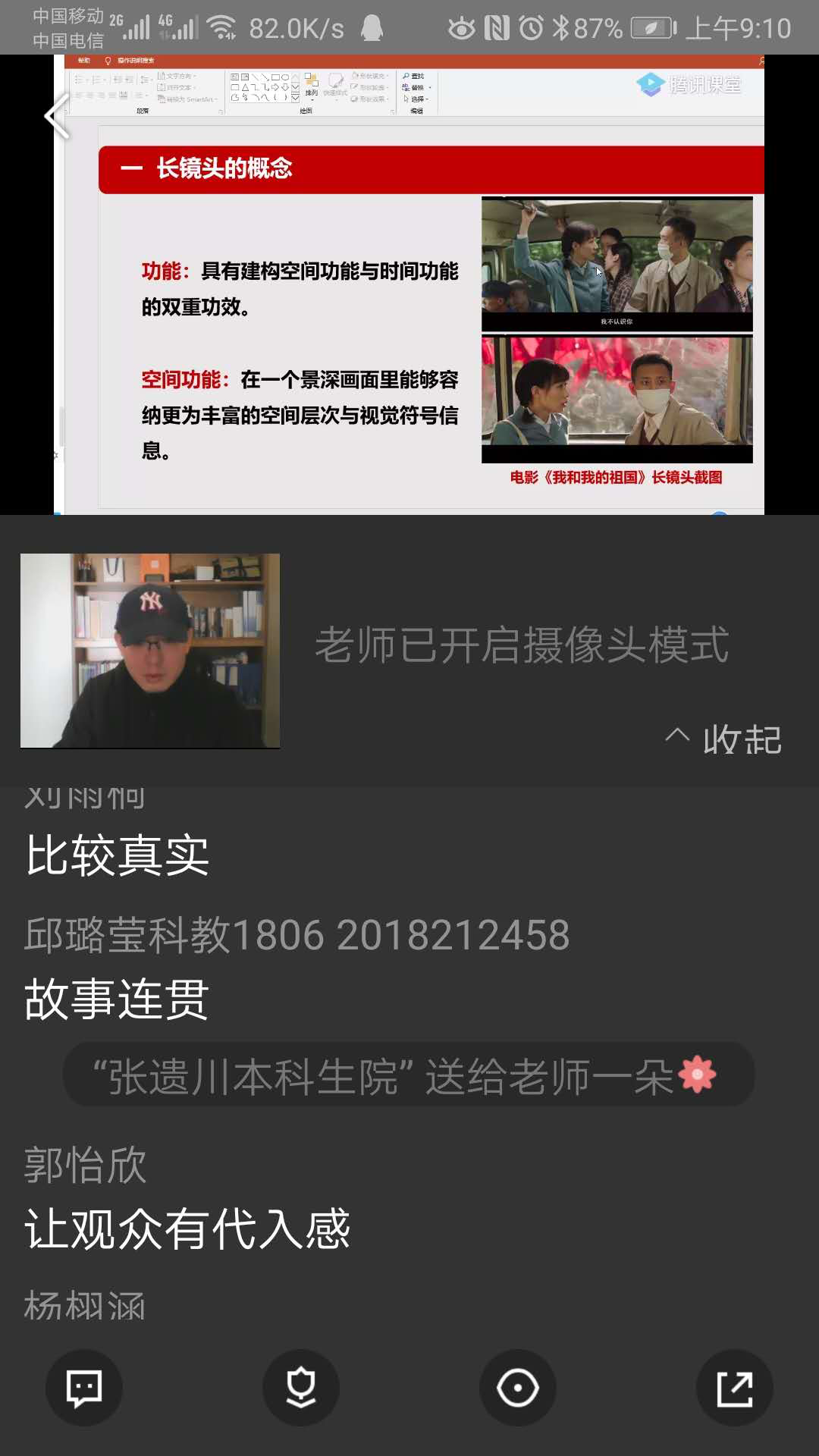 赵肖雄是我校教育信息技术学院数字媒体系青年教师,曾获学校第十届青年教师教学竞赛一等奖。得知学校决定延迟春季开学返校时间、实行网上如期开学上课的消息,他积极准备,并克服妻子赴美访学、家有年幼小孩需要照顾等困难,精心备课。在《编导基础》线上直播课中,他选用了腾讯课堂、云平台、QQ群、EV录屏软件作为“组合式”教学平台,综合运用讲授、案例教学、自主学习、讨论、融媒体教学等多种方法进行教学,为不同网络条件与学习环境下的学生提供多元选择方式。此外,他还搜集了学生在线上学习过程中的困难并提出了改进措施。在2月20日的第二讲中,他通过腾讯课堂平台直播上课,从电影《我和我的祖国》引入,通过知识点讲解、案例分析、启发研讨、布置研究性学习任务等方式,深入浅出地讲授了“长镜头与镜头长度”这一内容。