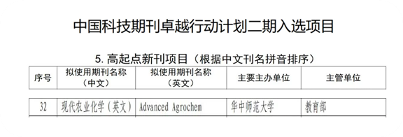 华大在线讯(通讯员 叶莺)近日,由我校和中国化学会农业化学专业委员会共同主办的期刊Advanced Agrochem入选中国科技期刊卓越行动计划二期高起点新刊项目。