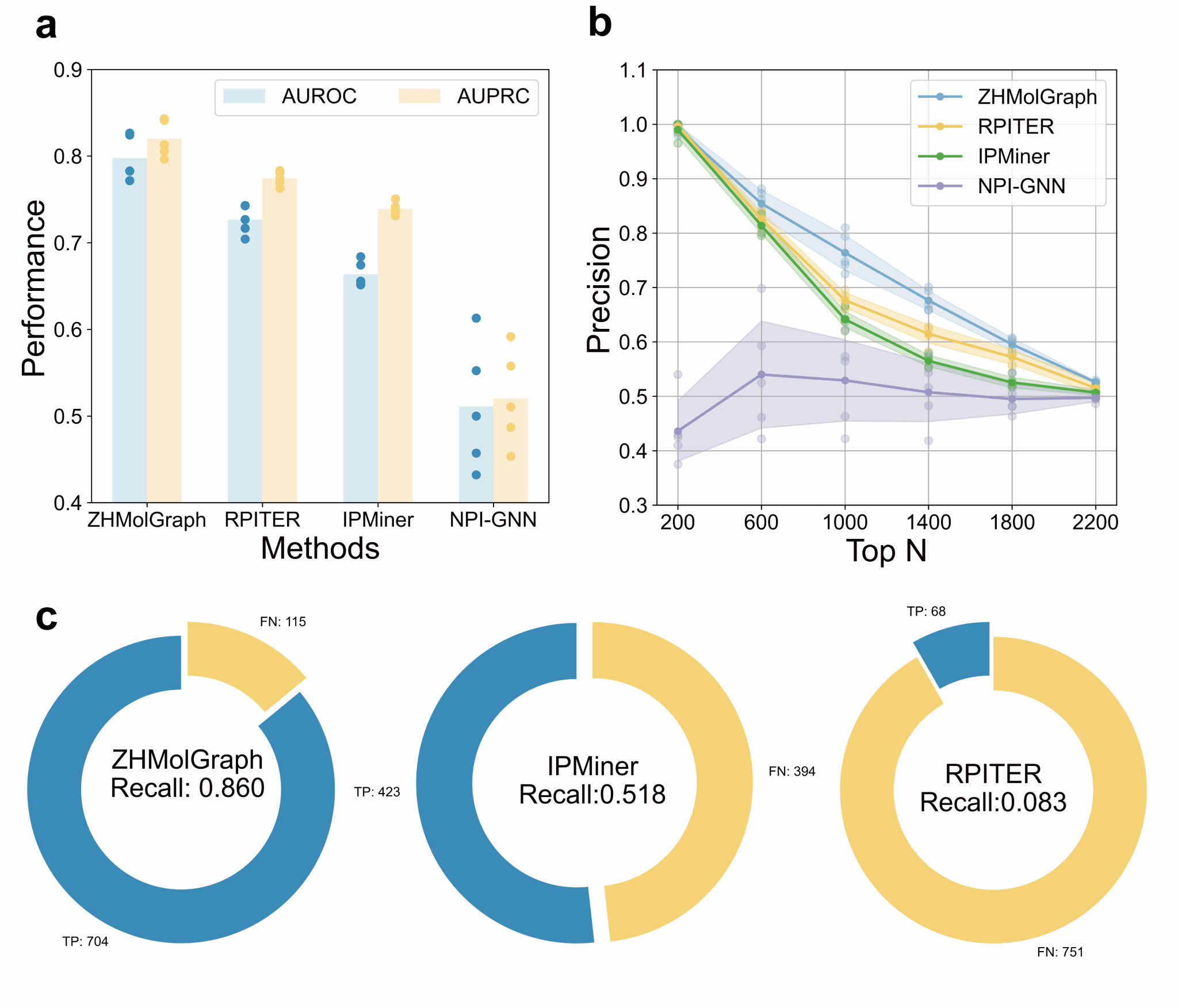 图2. 未知RNA-蛋白质相互作用预测性能评估。a, b 在未知RNA和蛋白质数据集TheNovel上,ZHMolGraph的平均AUROC和AUPRC(图a)和预测概率排序精确度(图b)显著优于现有方法。c SARS-CoV-2相关RNA-蛋白质相互作用预测结果表明,ZHMolGraph的召回率显著优于现有方法。