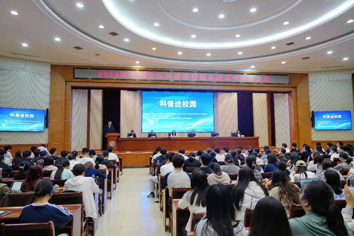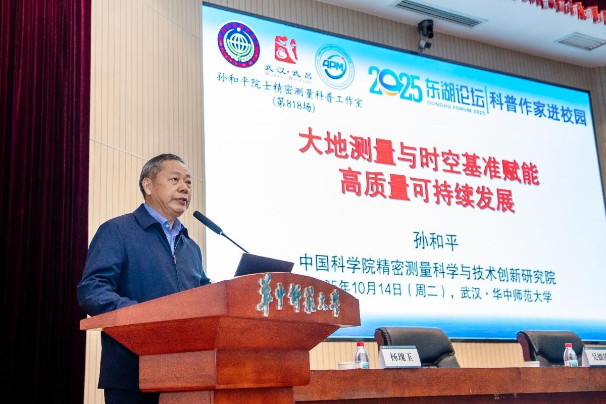 华大在线讯(通讯员 吴梦茹)10月14日,由科普时报社、长江少年儿童出版社(集团)有限公司、武汉市新华书店有限公司与我校联合主办,我校图书馆(博物馆)承办的2025年“科普进校园”专题讲座在科学会堂举行。我国大地测量与地球物理学领域的著名专家、中国科学院院士孙和平应邀作题为“漫步时空隧道——精密大地测量与时空基准”专题报告。副校长吴丹出席并致辞,200余名师生共同聆听本次讲座。