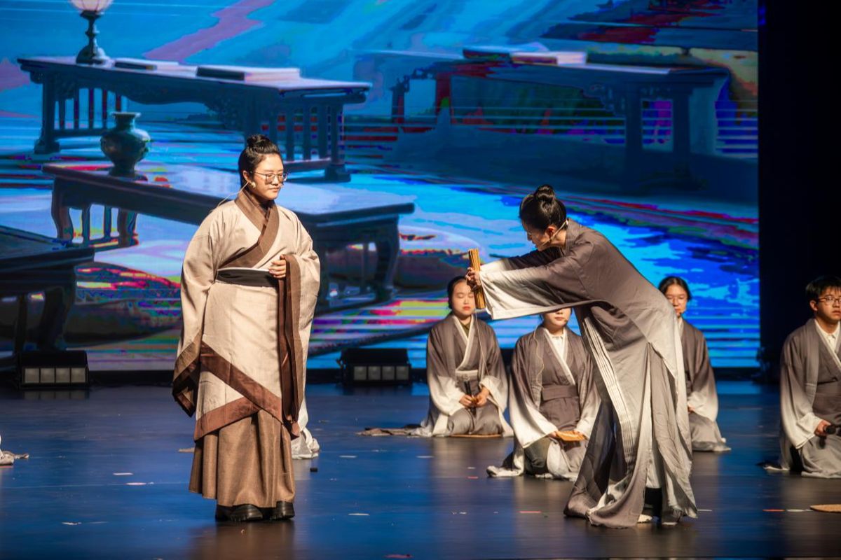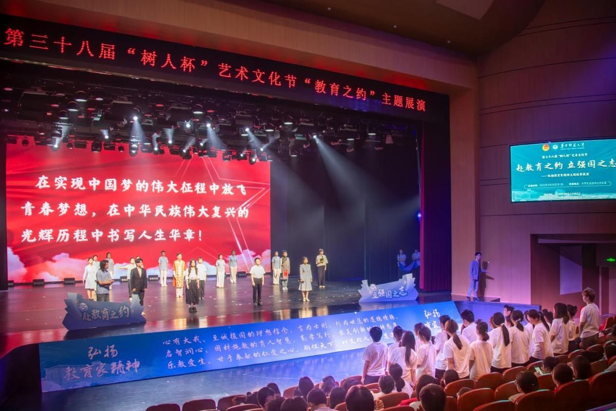 展演以“赴教育之约,立强国之志”为主题,通过舞蹈、话剧、朗诵、音乐剧等多元艺术形式,串联起从孔子“因材施教”到现代教育改革的壮阔画卷,致敬历代教育者的坚守与创新。开场舞蹈《九州同》在光影流转中演绎中华教育文明的生生不息。《杏坛弦颂》生动还原了千年前孔子及其弟子“侍坐论志”“学思之辩”等经典场景。歌曲《桂子山红》以诗化的语言串联华师百廿校史,六名演唱者立于银杏叶铺就的舞台,唱响“育才路上年轻的沸腾,桂香灵动点燃心中赤忱”的华师新声。《以爱育爱,一路生花》通过讲述张桂梅、章开沅的事迹,展现出他们身上“乐教爱生、甘于奉献”的仁爱之心。原创朗诵剧《破旧立新启主体教育继往开来育天下桃李》讲述了华师教育学者推动“主体性教育”改革的历程。舞台剧《华小诗》体现了技术赋能教育的精准高效,凸显了“代码写不出信任”的情理问题。《青春无问西东,奋斗自成芳华》中,西部支教志愿者列队宣誓,“到孩子需要的地方去,以青春小我书写强国大我!”晚会在光影交错中落下帷幕,定格于甲骨文“教”字,寓意教育文明亘古长青。