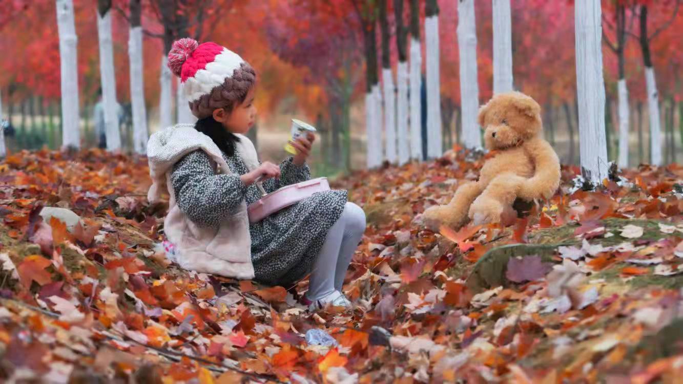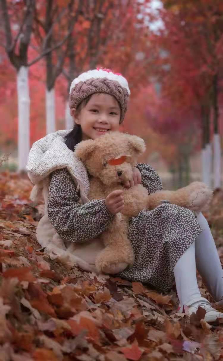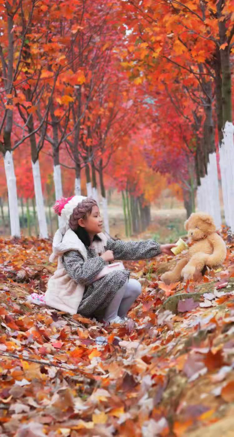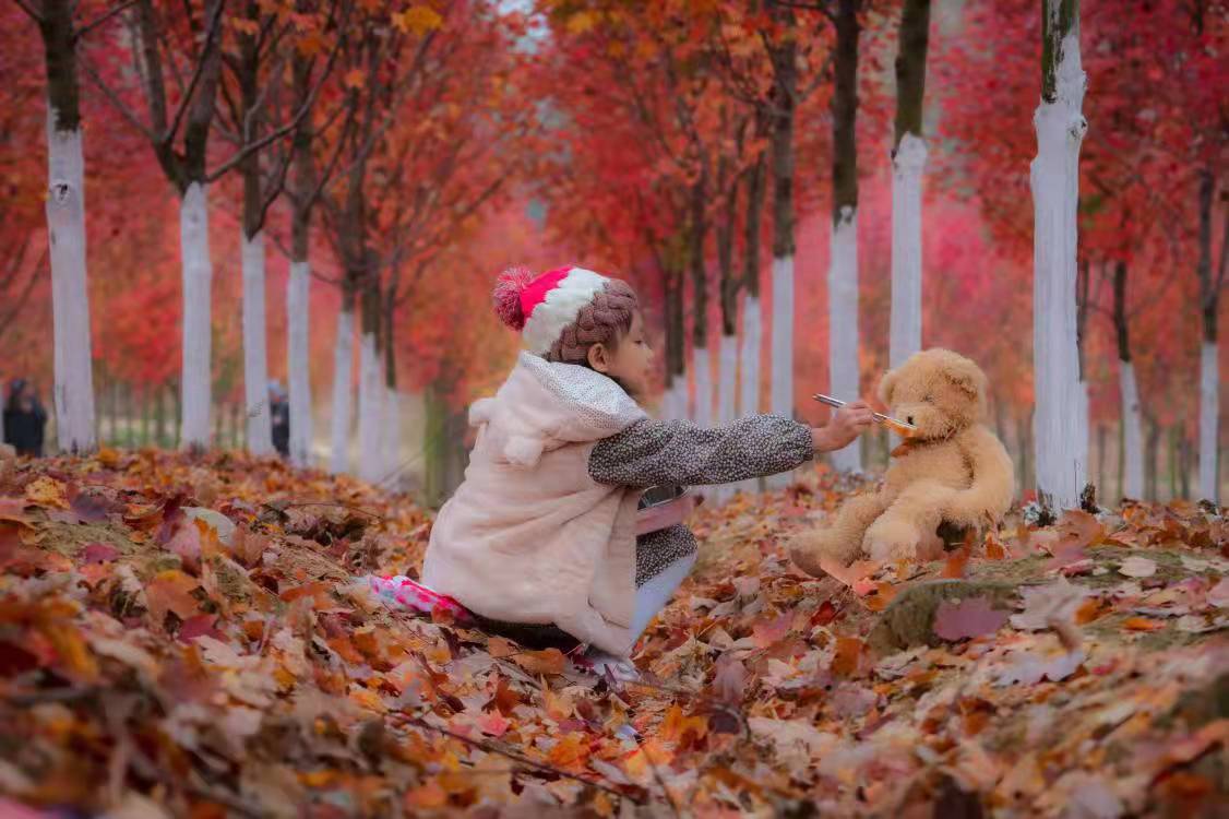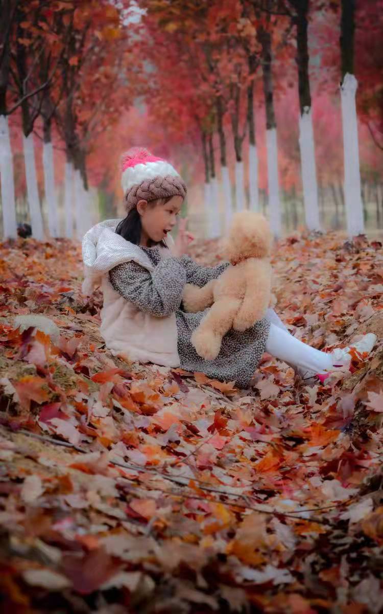 胡永刚老师是华中师大附小的美术教师,他导演拍摄了一组秋意的图片,绘画爱好者黄圣易小朋友、布偶小熊及其枫树林都是秋意作品的主角。这组枫树林中的照片,如同油画般,展示了一个美丽的童话世界——小女孩和小熊的友谊,呈现出一幅“天地人和”的生态美。