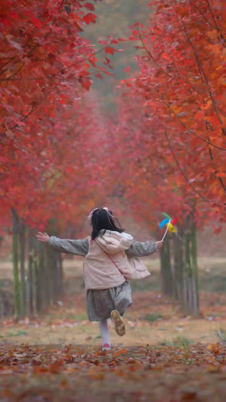 第一张照片,她找小熊。她右手拿着风车,朝着红色枫树林奔跑,似乎在边跑边呼喊:“小熊,小熊,你在哪里,你在哪里,姐姐来哪!”