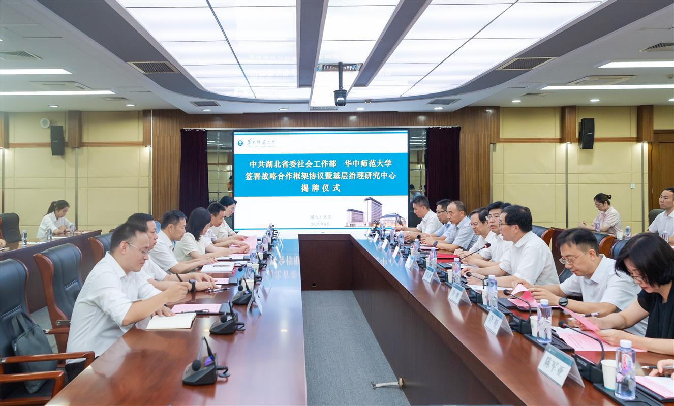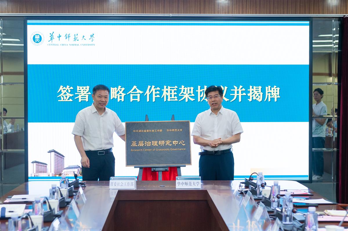 华大在线讯(通讯员 凌洁)8月4日,中共湖北省委社会工作部与我校签署战略合作框架协议。签约仪式上,省委社会工作部部长、两新工委书记蒋星华和校长彭双阶共同为“华中师范大学基层治理研究中心”揭牌。省委社会工作部二级巡视员朱红,副校长任友洲,我校政治学部部长、人文社科资深教授徐勇出席仪式。