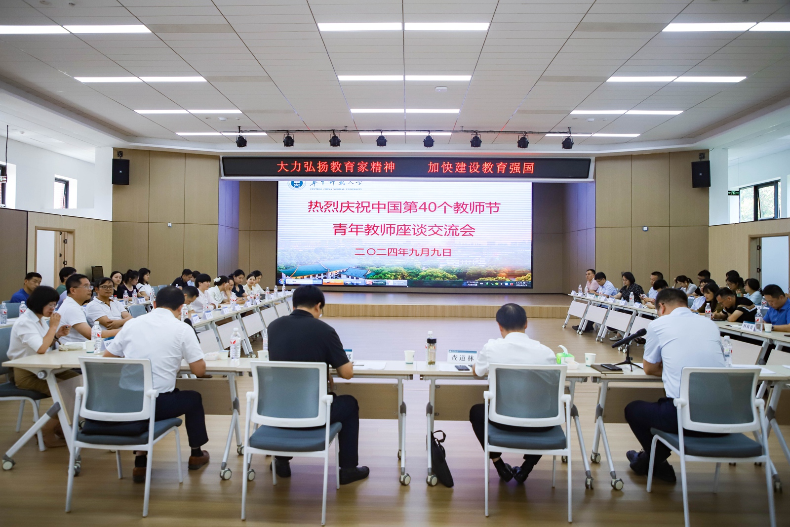 华大在线讯(通讯员 谭雅涵 左焦杰)为庆祝第40个教师节,促进教师队伍高质量发展,9月9日,青年教师座谈会在老年文化活动中心五楼报告厅举行。校党委副书记查道林出席并讲话。我校劳模工作室主持人、第五届“十佳青年”、各级“青教赛”青年教师代表以及党委组织部、人事部、校团委、本科生院、研究生院、科技处、社科处、教师教育学院等部门负责人参加会议。