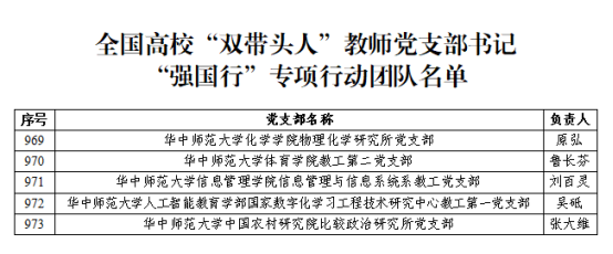 华大在线讯(通讯员 李杰)近日,教育部办公厅公布了全国高校“双带头人”教师党支部书记“强国行”专项行动团队(以下简称“强国行”专项行动)名单,我校5个党支部入选。
