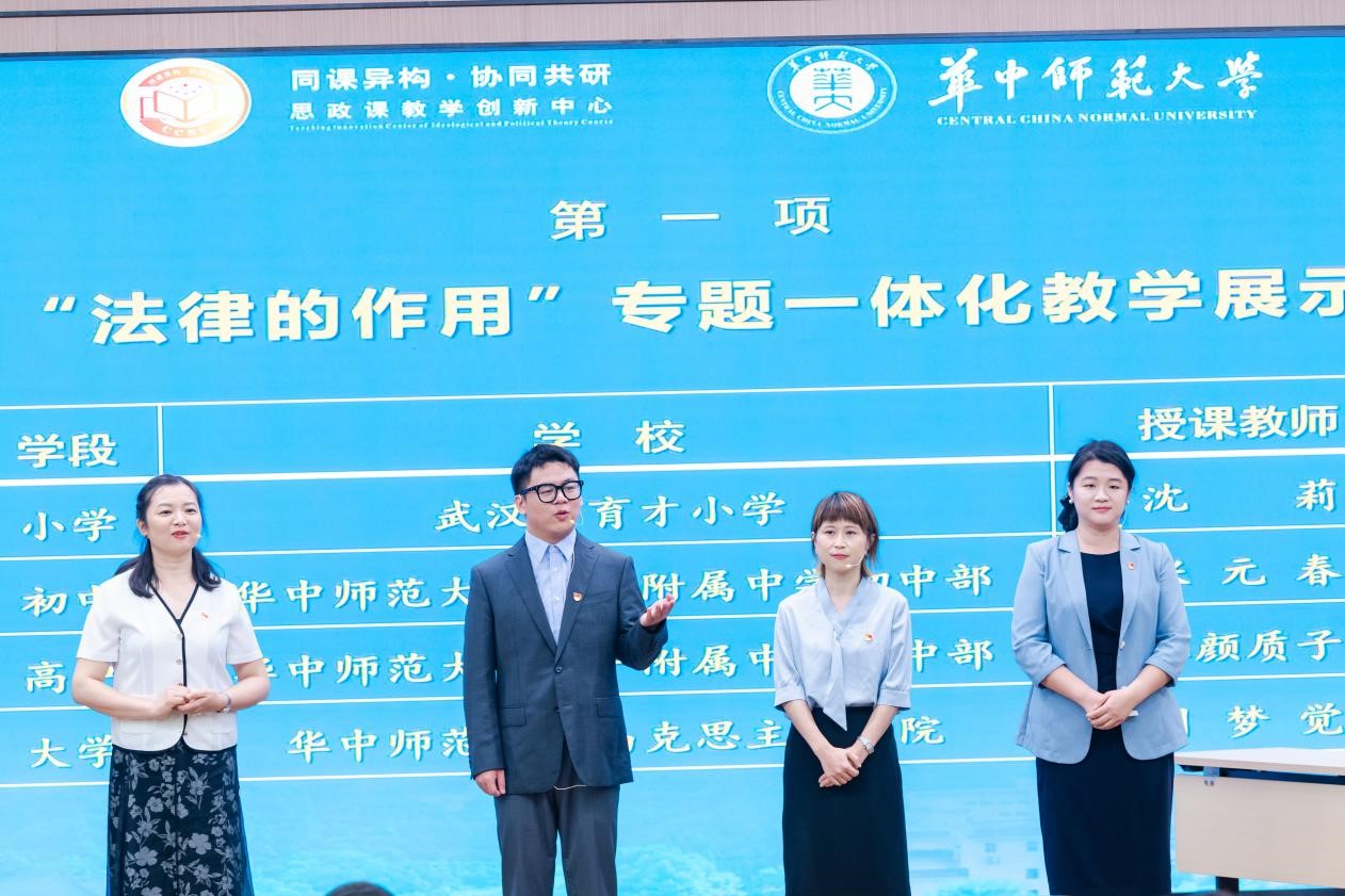 大中小学思政课一体化教学展示与点评环节,来自武汉市育才小学沈莉、华中师大一附中初中部张元春、一附中高中部汪颜质子和华中师大马克思主义学院刘梦觉等4位思政课教师采取“有生课堂”的形式,共同围绕“法律的作用”这一专题进行了一体化现场教学展示。陈大文在点评时谈到,4个学段教师的教学展示充分体现了一体化的教学理念,准确把握了本专题的核心内容,灵活选取了联系生活实际的教学案例,生动诠释了循序渐进、螺旋上升的要求。