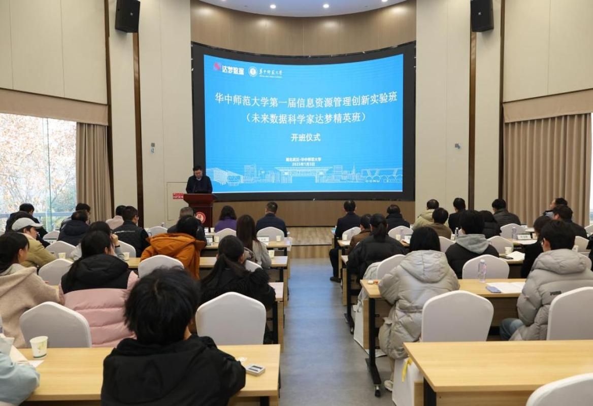 华大在线讯(通讯员 蒋可鸣 龙思勤)1月3日,我校第一届信息资源管理创新实验班(未来数据科学家达梦精英班)开班仪式在桂苑宾馆一楼报告厅举行。武汉达梦数据库股份有限公司总经理皮宇、高级副总经理王婷、产品服务中心总经理黄海明,武汉达梦数据技术有限公司常务副总经理傅锦荣,武汉达梦数据库股份有限公司数据解决方案中心售前总监李庄庄、培训中心经理张守帅、湖北区销售经理张勇,校党委副书记陈迪明等出席。开班式上,相关单位责任人分别为校内外导师颁发聘书、为达梦精英班24名学生颁发录取证书。