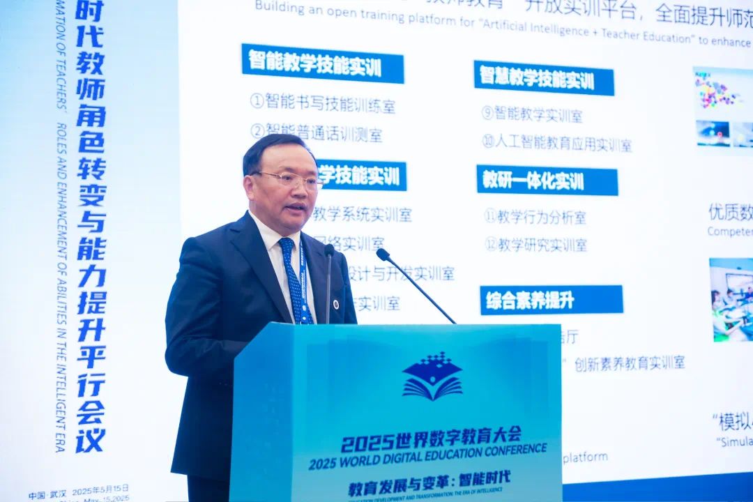 夏立新作“智能时代师范生培养:未来教师的使命与挑战”主旨报告。他从构建线上线下融合的一体化学习环境、开设师范生系列培育课程、研发“小雅”智慧教学平台支持师生教与学、打造AI赋能的学习新场景、创新师范生微格教学实训评价和课堂教学质量评价、构建基于3D技术的数字孪生校园、打造校园治理“数字驾驶舱”等方面,介绍了我校在智能时代对师范生培养路径的探索与实践。他表示,随着信息化不断发展,知识获取方式和传授方式、教和学关系都发生了革命性变化,对教师队伍能力和水平提出了新的更高的要求。展望未来,华中师范大学致力于将核心素养培养融入师范生教学实践全过程,注重培养师范生运用技术手段提升教育教学质量的能力,完善一体化的教师培养和培训体系,以培养智能时代高水平未来教师,支撑智能时代高质量未来教育。