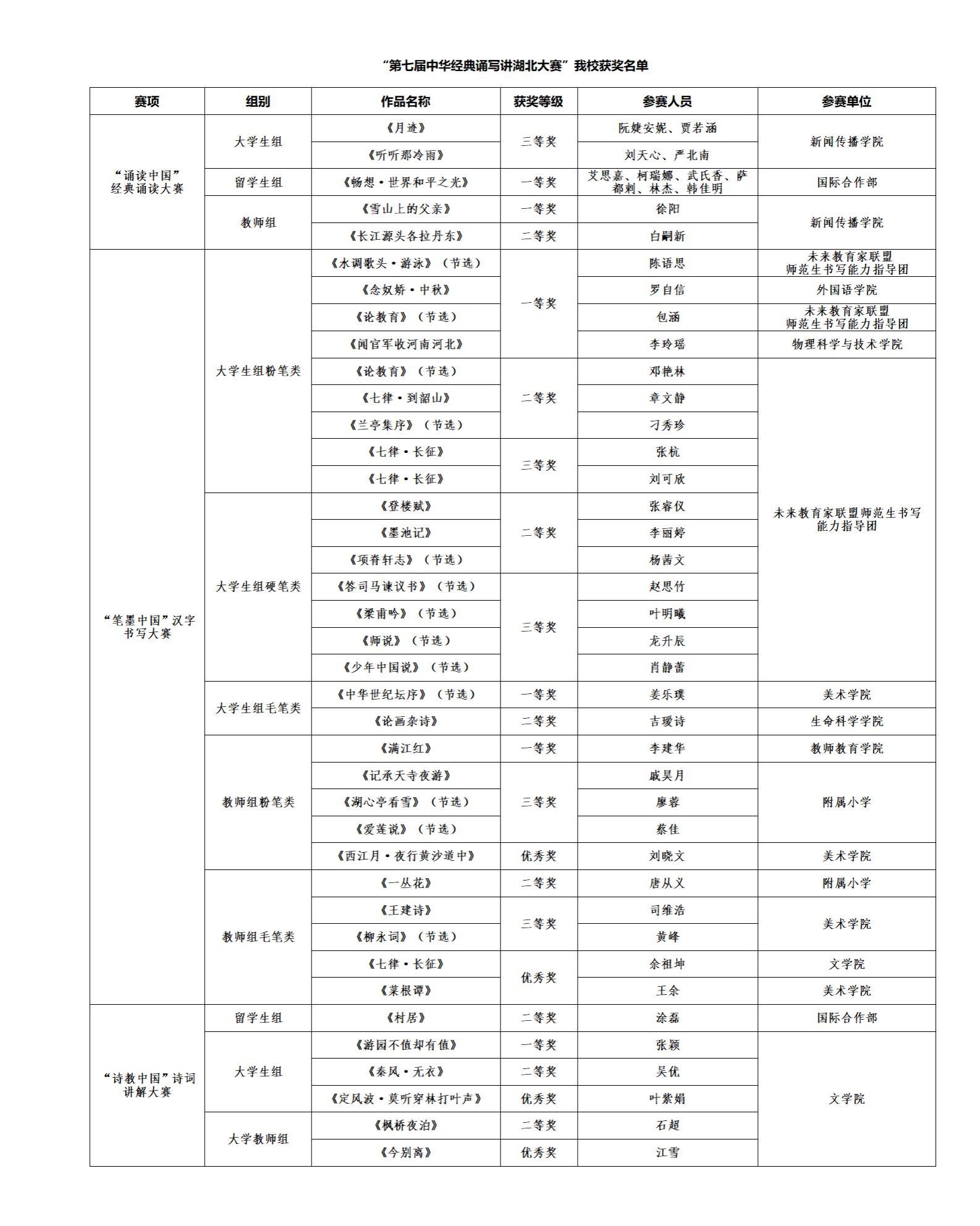 华大在线讯(通讯员 申定羽)近日,第七届中华经典诵写讲大赛湖北赛区获奖名单公布,我校选送作品全部获奖,共计获奖42项。其中,一等奖9项,二等奖12项,三等奖13项,优秀奖5项;学校荣获优秀组织奖3项。