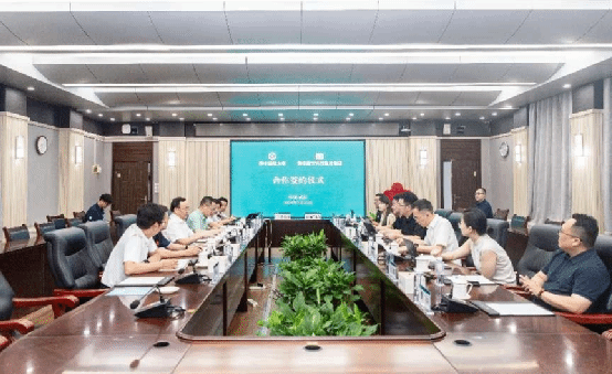 双方代表签署合作协议,夏立新、刘三女牙、陈军伟、何浩共同见证签约