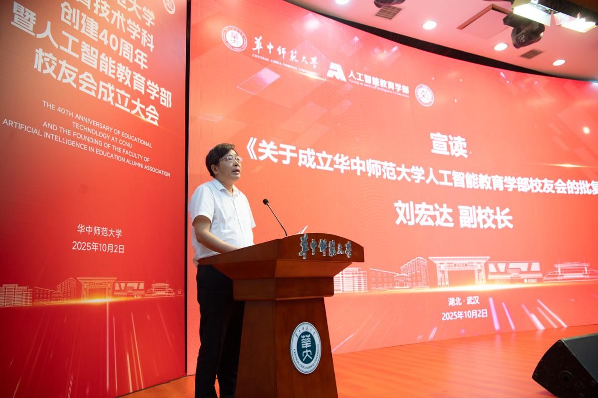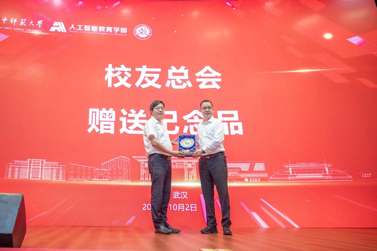 刘宏达宣读《关于成立华中师范大学人工智能教育学部校友会的批复》,代表校友总会向学部校友会赠送纪念品。