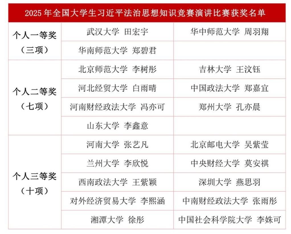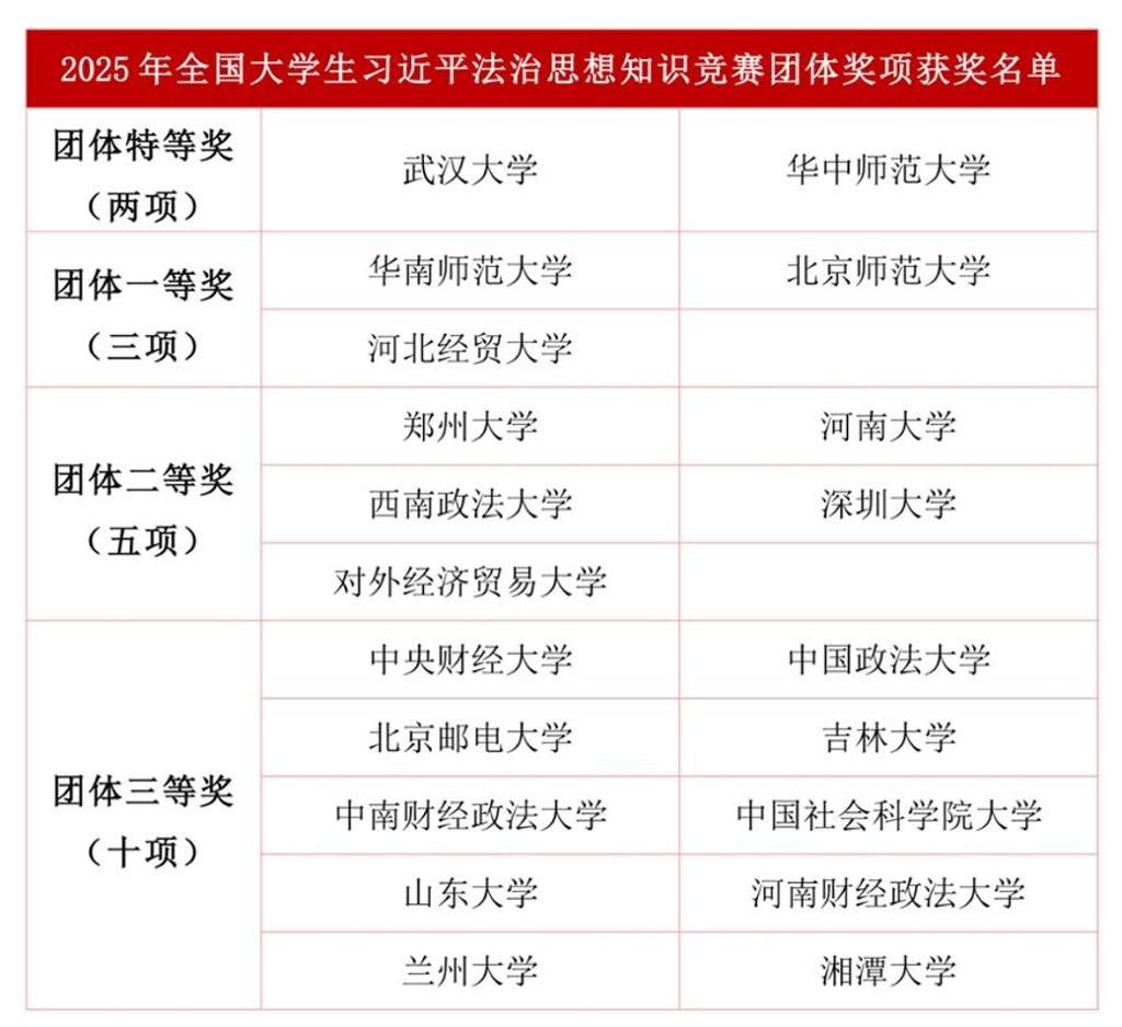 华大在线讯(通讯员 张永基 周羽翔)11月16日,在习近平法治思想提出五周年之际,2025年全国大学生习近平法治思想知识竞赛决赛在中国政法大学昌平校区举办。我校代表队脱颖而出,斩获团体特等奖(共2个)和个人一等奖(共3个)。