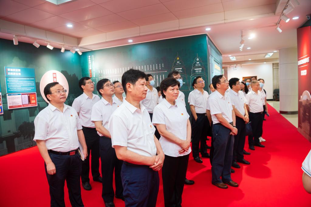 全体校领导、校党委中心组成员、党史学习教育领导小组办公室成员在九号楼融媒体中心集中收看了庆祝中国共产党成立100周年大会电视直播,直播结束后前往科学会堂一楼展览厅为“庆祝中国共产党成立100周年——华中师范大学红色印记展”揭幕并进行了参观。现场的文献资料和精致的时间轴设计生动展示了中国共产党百年来历经的红色印记,给在场的党员上了一堂生动的沉浸式党史学习教育大课。