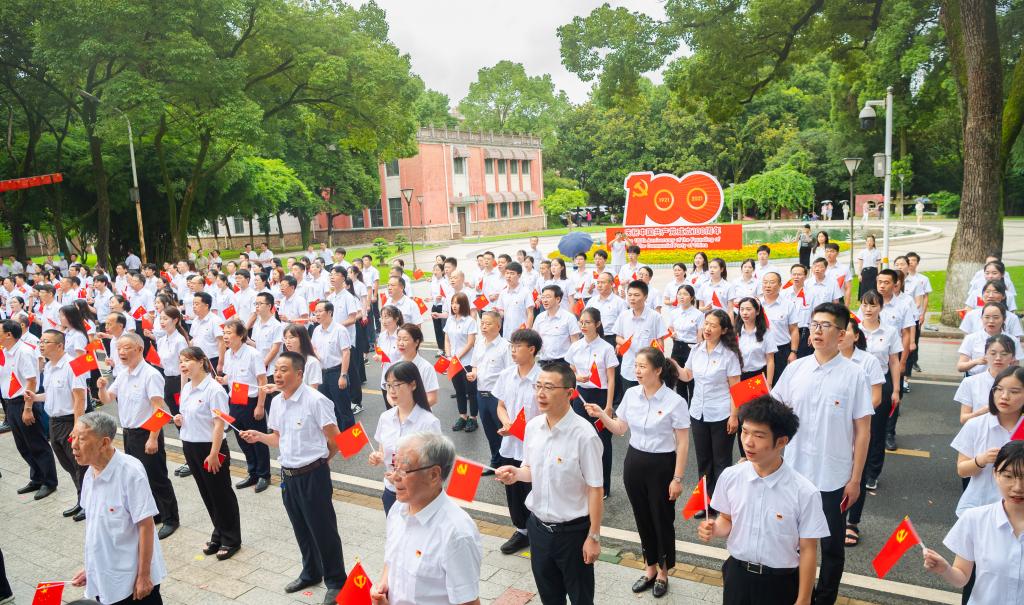 华大在线讯(记者 毛国樨)明灯百年照,丹桂双甲香。7月1日,学校隆重庆祝中国共产党成立100周年。清晨7点,200余名师生党员在文华公书林前举行升国旗仪式,全体校领导、校党委中心组成员、党史学习教育领导小组办公室成员、职能部门党员负责人、各分党委书记副书记、在党50年老党员、7月1日出生的党员和今年入党的师生新党员代表等参加了此次活动。仪式由校党委副书记查道林主持。