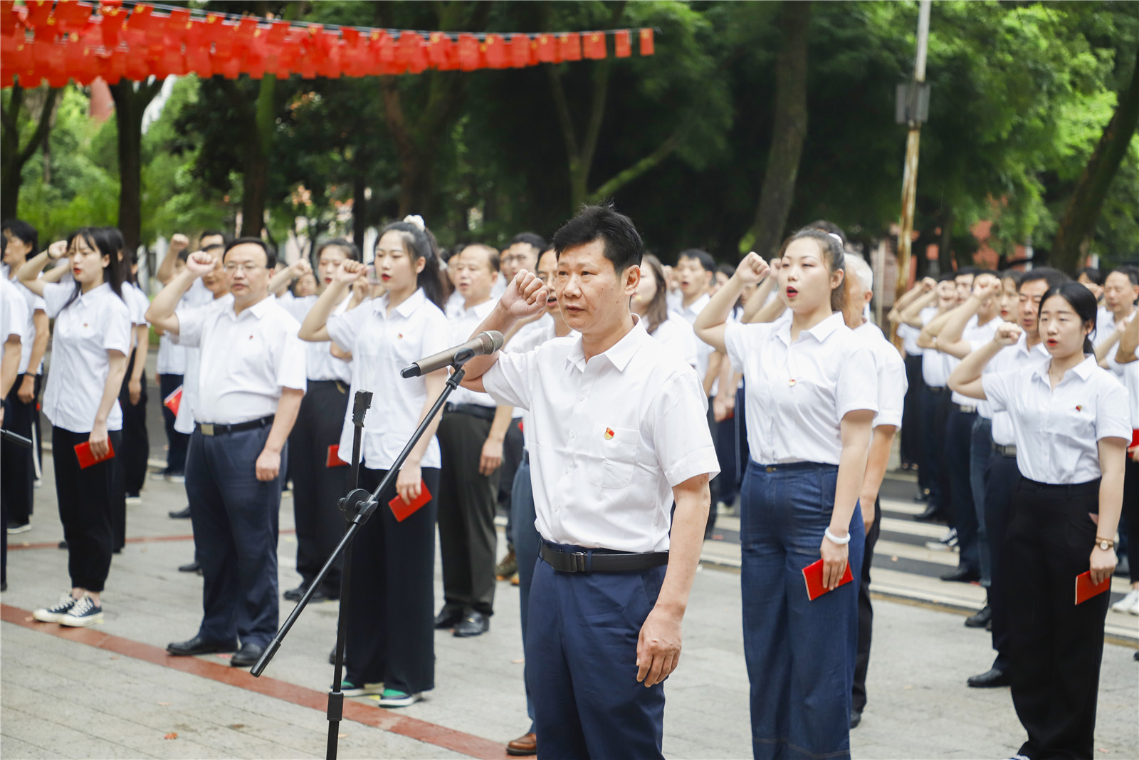 在党的百年华诞之际,学校1346名师生光荣地加入了党组织,为党的肌体注入了新鲜血液。升旗仪式后,100名老党员代表为100名新党员代表赠送了《党章》和党员徽章。红彤彤的《党章》和党员徽章象征着党员的责任担当,新党员接过《党章》和党员徽章的同时,也传承了老党员身上的优良传统和沉甸甸的责任。在这庄严而神圣的时刻,由校党委书记赵凌云领誓,新党员进行入党宣誓,老党员重温入党誓词。