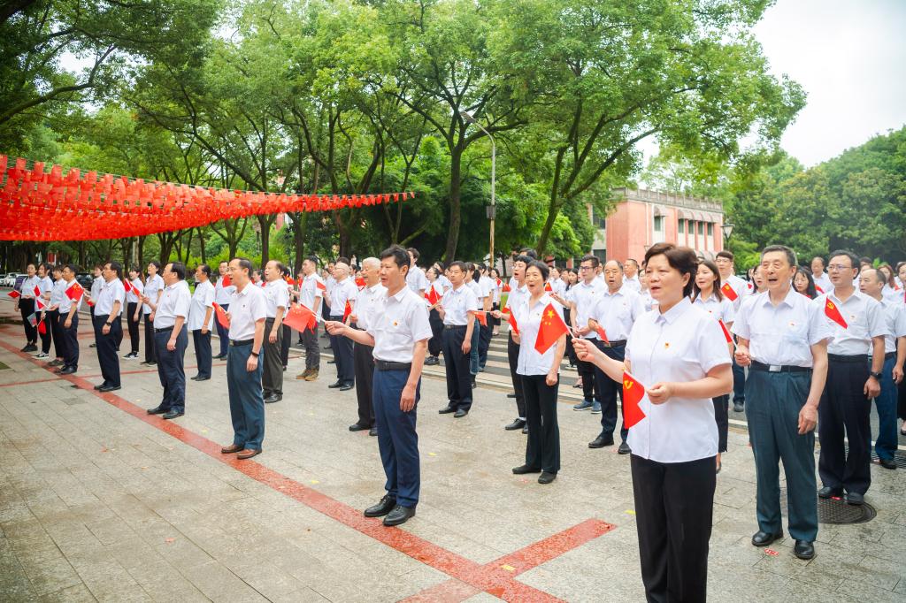 现场师生手持党旗,齐声合唱《唱支山歌给党听》,在一片红色海洋中以深情的歌声庆祝党的生日。