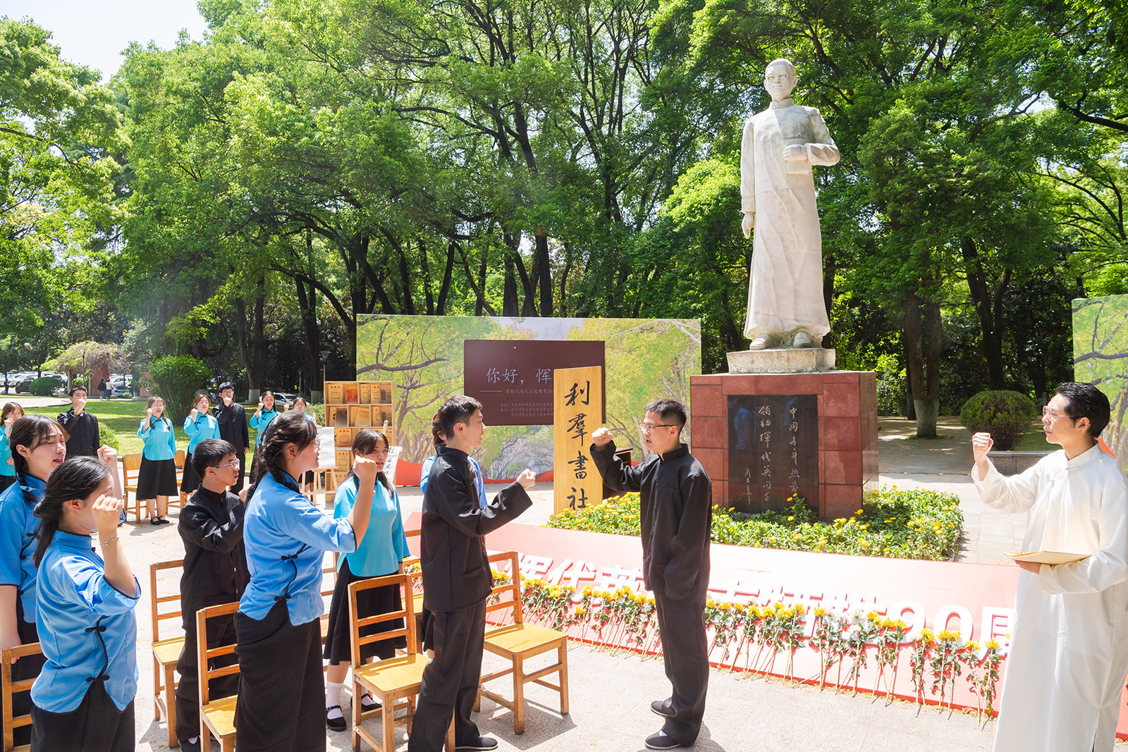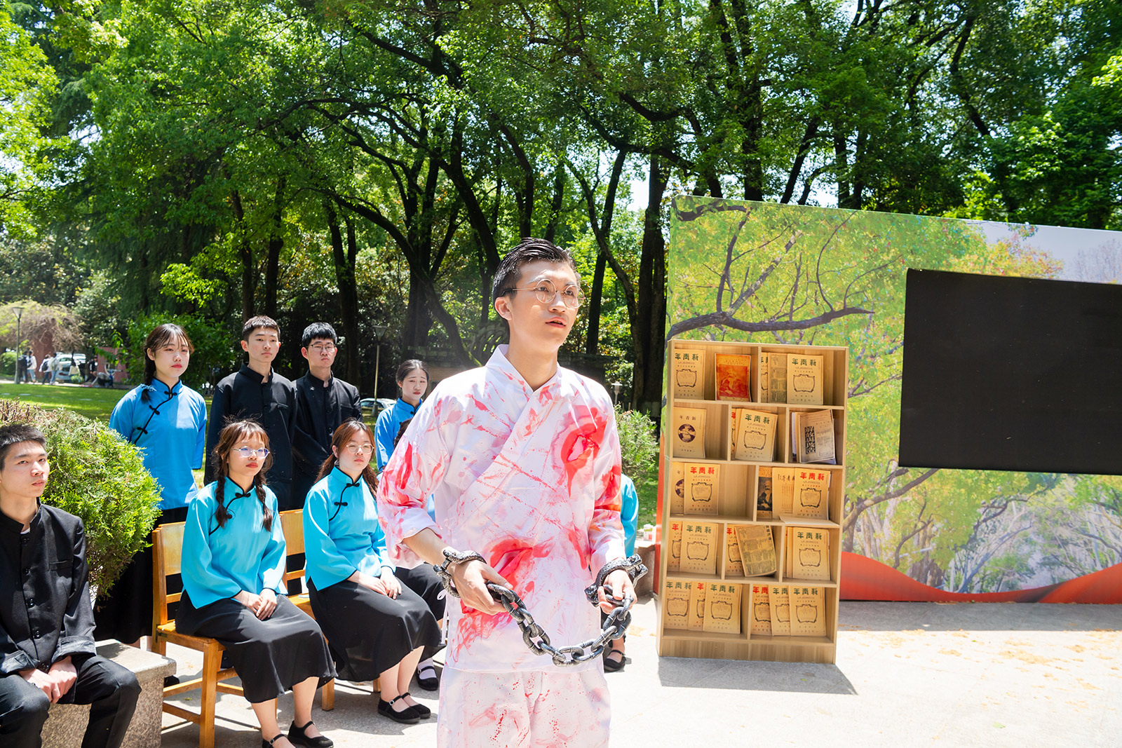 四月的早晨,春光明媚,恽代英雕像沐浴在金色的阳光中,显得庄严而诗意。师生自编自导自演的沉浸式主题教育话剧《你好,恽代英》,就在恽代英的雕像下上演。话剧总共分为四幕,重现了恽代英引领五四风潮,创办利群书社及主编进步刊物《中国青年》,被捕后英勇就义的革命历程,还原出一个与青年学生同战线,用思想革新求进步,以革命事业为己任的革命先驱形象。“国不可不救,他人不肯救,则唯靠我自己!”身着白色长衫的青年恽代英振臂高呼,掷地有声的话语回荡在鸦雀无声的广场周围,显得铿锵有力。在场师生沉浸其中,仿佛是在透过这场特殊的话剧展演,从学生们青涩而赤诚的演绎中,同百年前的青年楷模心灵交汇,瞻仰那一代中国共产党人矢志救国的豪情壮志。