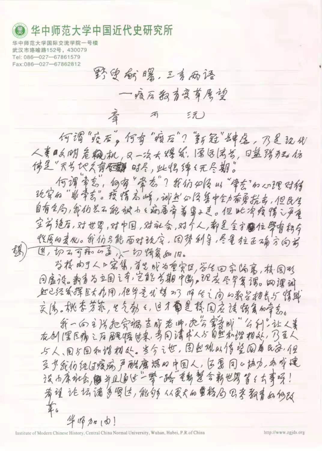 章开沅先生常言,“历史是画上句号的过去,史学是永无止境的远航。”章开沅先生的脚步从来没有停止,思考也没有停止。他的心怀关注着青年、教育和文明,他的眼光连接过去、现在和未来。在我们心里,先生永远年轻!永远活在我们心中!