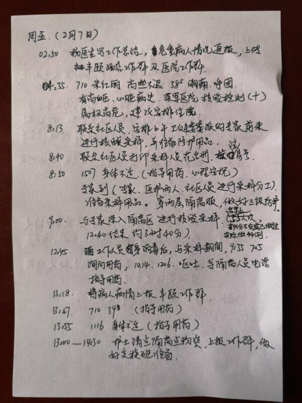 2月7日凌晨,杨立新和谭昱霖接到通知,区卫健委上午9点要安排1名医生对隔离点所有病患做核酸检测采样,要求连夜做好物品准备。这是一次极具危险的工作,因为病人可能会出现呃逆情况,大量的病毒就会喷射出来,感染的风险极大。采集工作开始前,他们相互提醒,一遍又一遍检查防护服、护目镜是否穿戴规范,对后续采集的每个步骤、每个细节和突发情况的应急方案作了讨论。采集过程中,许多上了年纪的老同志或记不清身份证号,或老花眼看不清楚身份证,只有递给他们抄写;一个女病人因错过了楼层集中采集时间,而提出要求单独补充采集;过程中他们还要努力摆脱护目镜戴久了产生的雾气影响。整整4个小时,他们共完成了54位病人的核酸采集。工作完成后,防护服已经从里到外湿透了。牙科医生杨立新工作日志中写道:“边学边干是我们这次工作的一个特殊性,这是我们第一次参与核酸样本的采集,跟卫健委派来的李医生学到很多工作经验,这次参与采集对我们后面的工作有很大的帮助,回头还要再普及一下核酸检测的意义,检查结果对我们筛查和分离病人很关键,它关系到新冠病毒防疫战的成败。”黄谦和黄代清在日志中写道:“今天特别高兴的是昨晚高烧近39度,诉胸痛呼吸困难的1109房70岁的爹爹现在体温已经接近正常”。而诸如此类的工作日志是他们之间最好的工作交流。他们说,记录下这些,就能给彼此一份精神的支撑,也可以对后面接班的医护人员争取时间,让他们尽快熟悉工作,少走弯路。然而,在进驻隔离点的工作结束之后,等待这六位医护人员的是14天的隔离。他们舍小家顾大家,用大爱为隔离人员撑起一片精神家园。