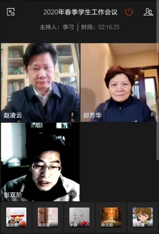 四个部门的负责人对学生工作进行全面部署与安排后,校长郝芳华发言。她首先对全校学工系统在疫情防控工作中的辛勤付出表达感谢与敬意。接着,她从如何压实工作责任、统筹抓好疫情防控和学生工作这两个方面谈到了“三个抓好”。首先是抓好学生的思想政治教育,在“时”字上下功夫。她强调,疫情就是命令,战役也是课堂,疫情中涌现出的鲜活的例子给学生留下了珍贵的教育素材,要通过思想政治主题教育、网上晚点名等对学生进行思想教育、生命教育、责任教育、忧患教育。二是抓好线上教学与返校管理,在“实”字上下功夫。各院系要提前谋划线上学习与线下课堂的对接问题,力争做到无缝对接与融合,并组织好学生融入到线上教学的课堂当中;要提前谋划学生的毕业就业问题,要动员全体教职员工、校友全员参与,运用广泛的社会资源,共同参与学生的就业工作;要继续运行疫情联防联控的机制,全校师生做好五个一律,做好学生返校的预案。三是抓好年度的重点工作,在“干”字上下功夫。各学院的书记需要统筹好疫情防控工作与中心工作,研究部署、提前谋划学院方方面面的工作,做到“两手抓,两手都要硬”,各学院有条件的先干起来,有难度的做好预案,争取疫情全部解除时各项工作有序衔接。郝芳华强调,“没有一个冬天不能逾越,没有一个春天不会到来”,相信在党中央的坚强领导下,在全校师生的共同努力下,我们一定能战胜病毒,打赢这场疫情防护的人民战争。