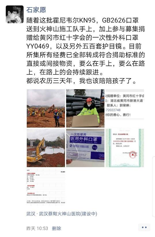 交通管制、物流紧张,为了减少配送员的负担,提高医疗物资的配送速度,不辜负所有捐赠者的信任,正月初三上午,石家愿给火神山医院施工队送去了一批GB2626、KN95口罩。“加上参与募集捐赠给黄石红十字会的一次性外科口罩YY0469以及另外500套护目镜,目前,所集所有经费已经全部转成符合捐赠标准的直接或间接物资,要么在手上,要么在路上,在路上的会持续跟进……”石家愿通过朋友圈告知着捐赠进展。