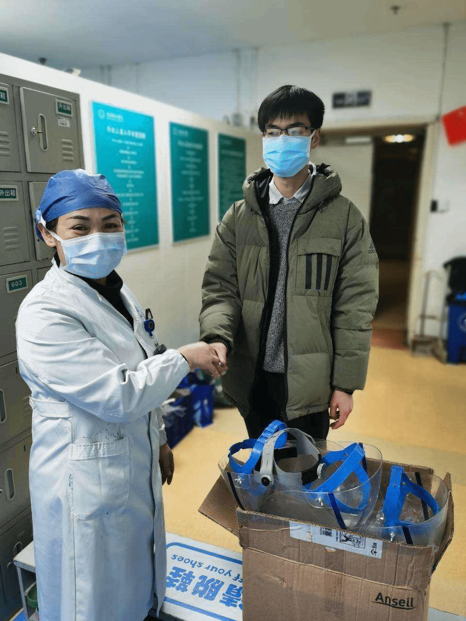将护目镜和防护面罩交付给协和医院护士长