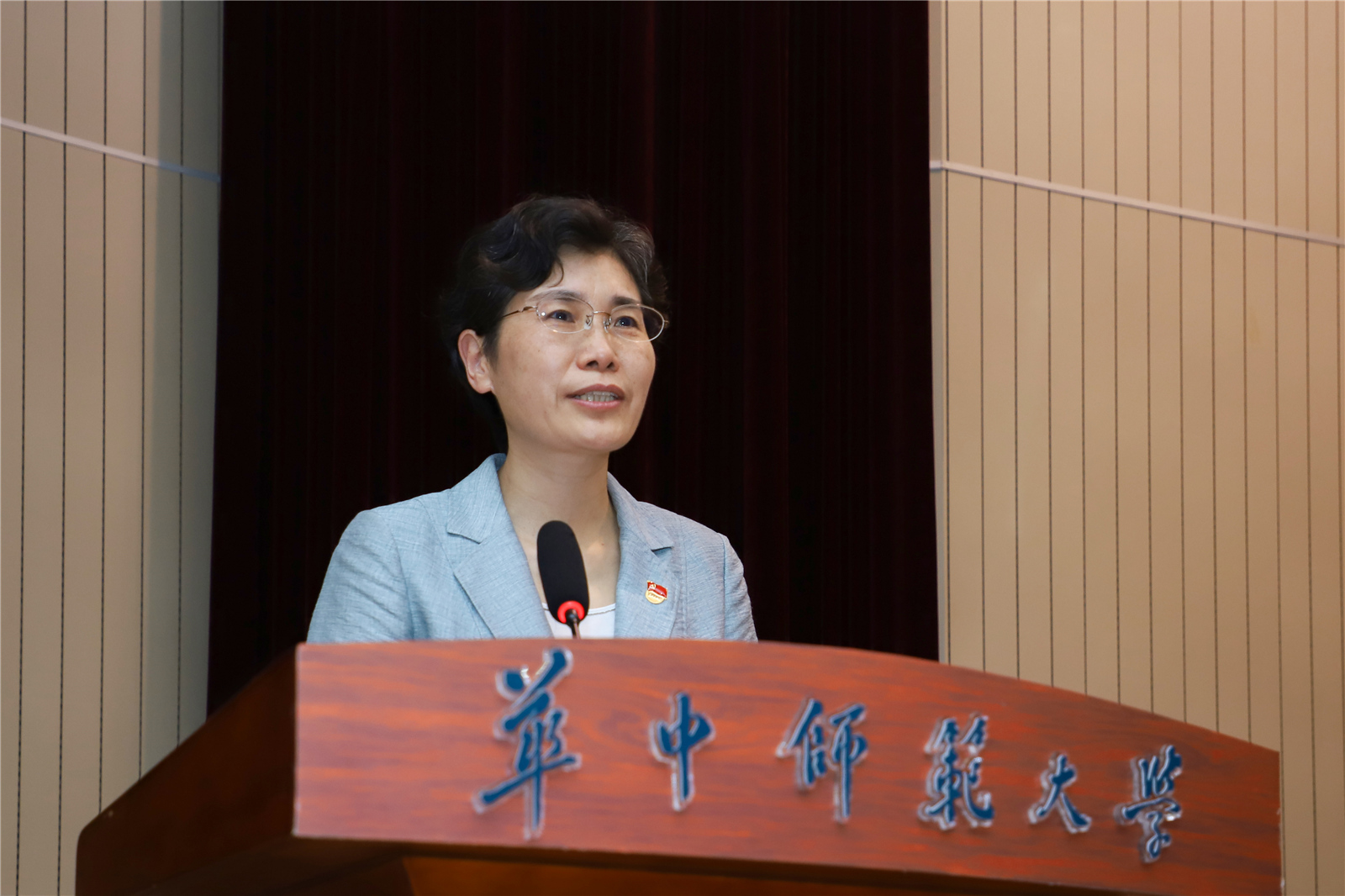 校党委书记黄晓玫代表学校党委,向受表彰的先进基层党组织、先进个人表示祝贺,向全体党员同志致以节日的问候。她指出,两年来,在上级党组织的正确领导下,学校党委认真学习贯彻习近平新时代中国特色社会主义思想和党的十九大精神,深入贯彻全国高校思想政治工作会议和全国教育大会精神,扎实推进全面从严治党,认真落实立德树人根本任务,党建工作取得了一些突出成绩:学校先后成功获批中组部第二批全国党员教育培训示范基地,湖北省“五个思政”综合改革示范高校;“双带头人”培养工程在湖北和全国高校产生了较大影响;化学学院物理化学研究所党支部、马克思主义学院恽代英学生党支部入选全国党建工作标杆院系、样板支部,社会学院学生李敏获评全国高校研究生党员标兵;学校成功申报教育部“高校思想政治工作创新发展中心”“高校思想政治工作队伍培训研修中心”。这些成绩的取得,是全校各级党组织紧密围绕学校中心工作,团结和带领广大党员创先争优的结果,是全体师生员工立足岗位,拼业绩、比奉献的结果。