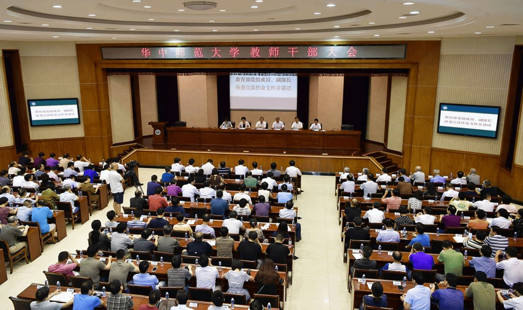 华大在线讯(通讯员 华轩)7月15日,我校在科学会堂召开全校教师干部大会,宣布教育部党组任免决定:赵凌云同志任华中师范大学校长、党委副书记;杨宗凯同志不再担任华中师范大学校长、党委副书记。