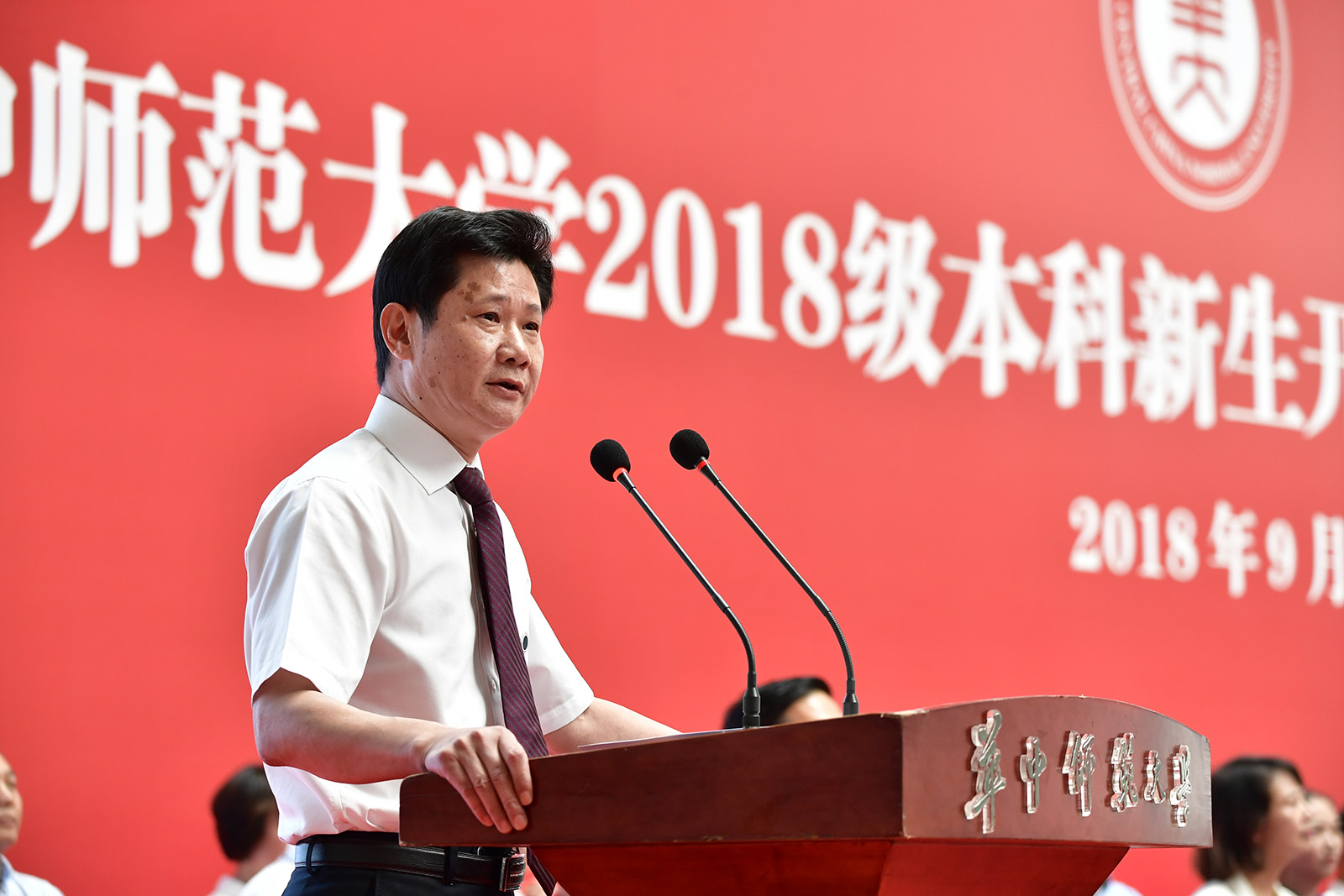 同学们,祝贺你们考入华师,开启人生新篇章。今天的典礼,标志着你们进入大学生活阶段。此时此刻,我希望你们认识到,大学阶段是决定人生宽度与高度的关键时期,这个时期的根本任务是成长成才。我希望你们,在未来的四年中,胸怀责任,发奋读书。