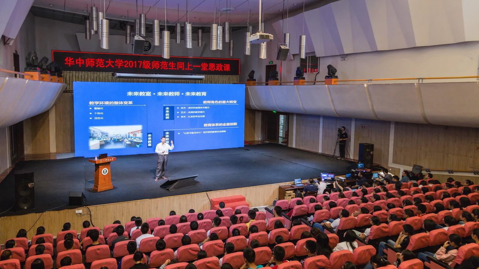 华大在线讯(记者 郝日虹)9月23日,我校2017级师范生在音乐厅、科学会堂和八号楼的智慧教室等多个场地同上一堂思政课,共同聆听杨宗凯校长与大家畅聊“信息时代的教育自信”。