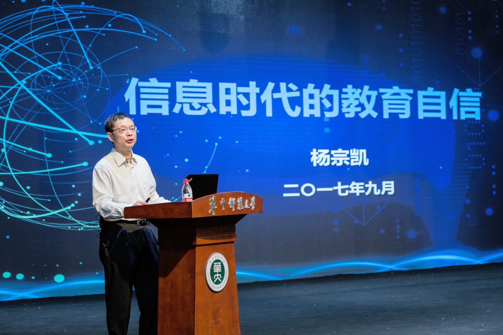 信息时代、教育自信、历史担当、中国梦……在杨宗凯校长的思政课堂上,这些宏大的命题不再是枯燥的理论说教。他用丰富详实的数据和生动鲜活的案例勾勒出的“教育信息化”远景,让同学们发现成就自己的精彩教育人生与实现“中国梦”之间的距离并非遥不可及。