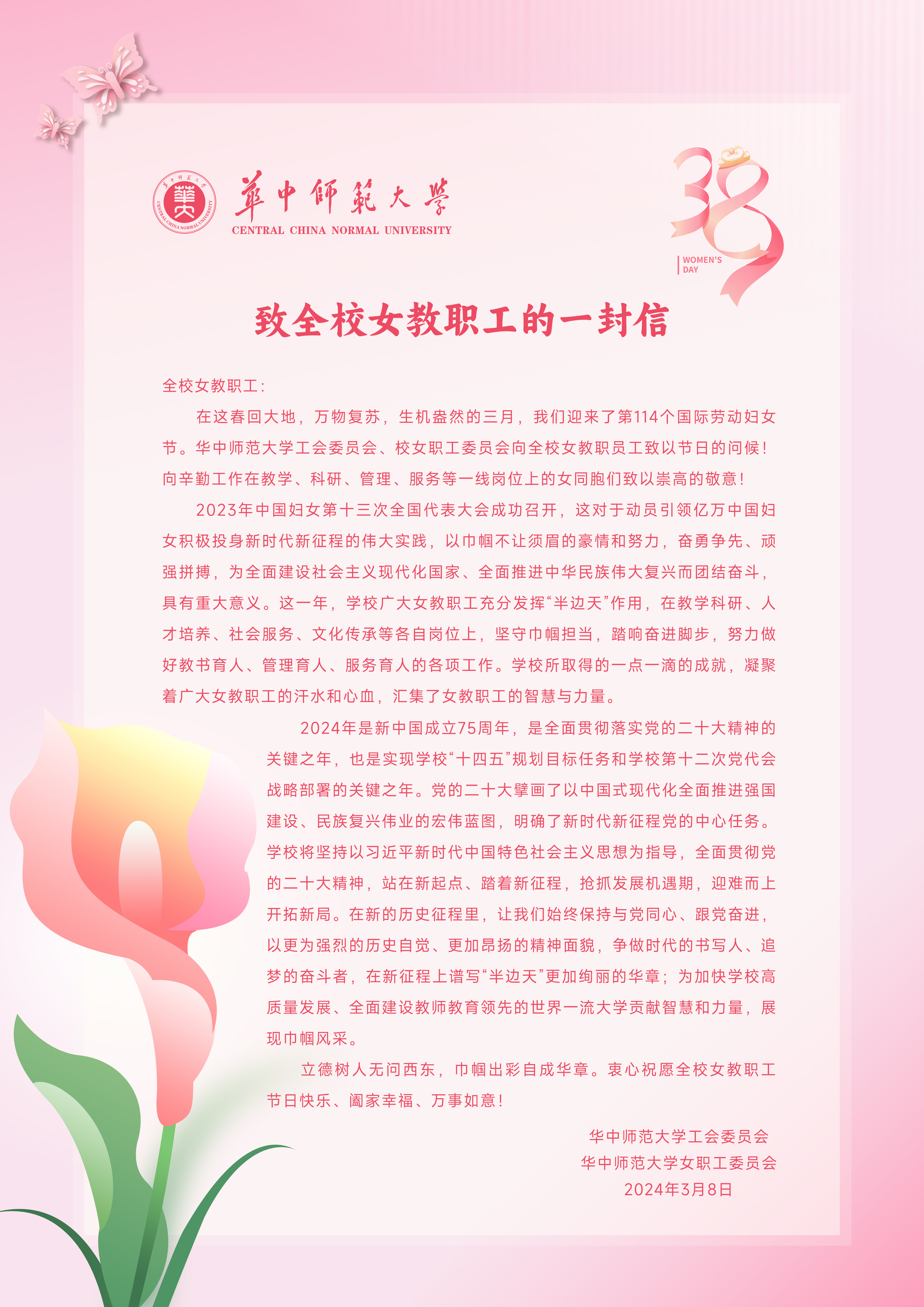在这春回大地,万物复苏,生机盎然的三月,我们迎来了第114个国际劳动妇女节。华中师范大学工会委员会、校女职工委员会向全校女教职员工致以节日的问候!向辛勤工作在教学、科研、管理、服务等一线岗位上的女同胞们致以崇高的敬意!
