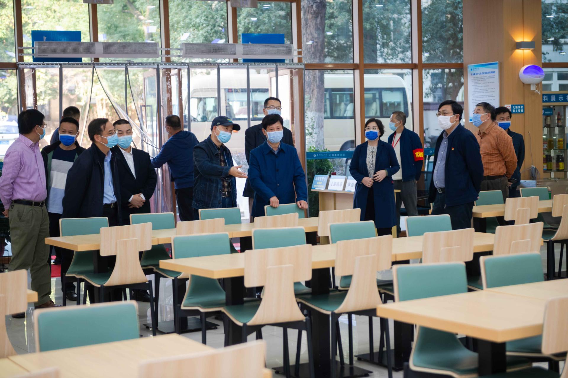 赵凌云一行先后深入沁园春食堂、大学生活动中心施工工地、学校东门入口、南湖食堂、西区家属区核酸监测点等地进行检查。在沁园春食堂和南湖食堂,赵凌云仔细询问了近期师生就餐情况,“希望你们能做到‘三个一点’。就餐间隔大一点,外带打包方便一点,用餐时间延长一点。”赵凌云要求各食堂加强用餐管理,提醒堂食师生注意用餐间隔,鼓励打包外带,适当延长供餐时间。