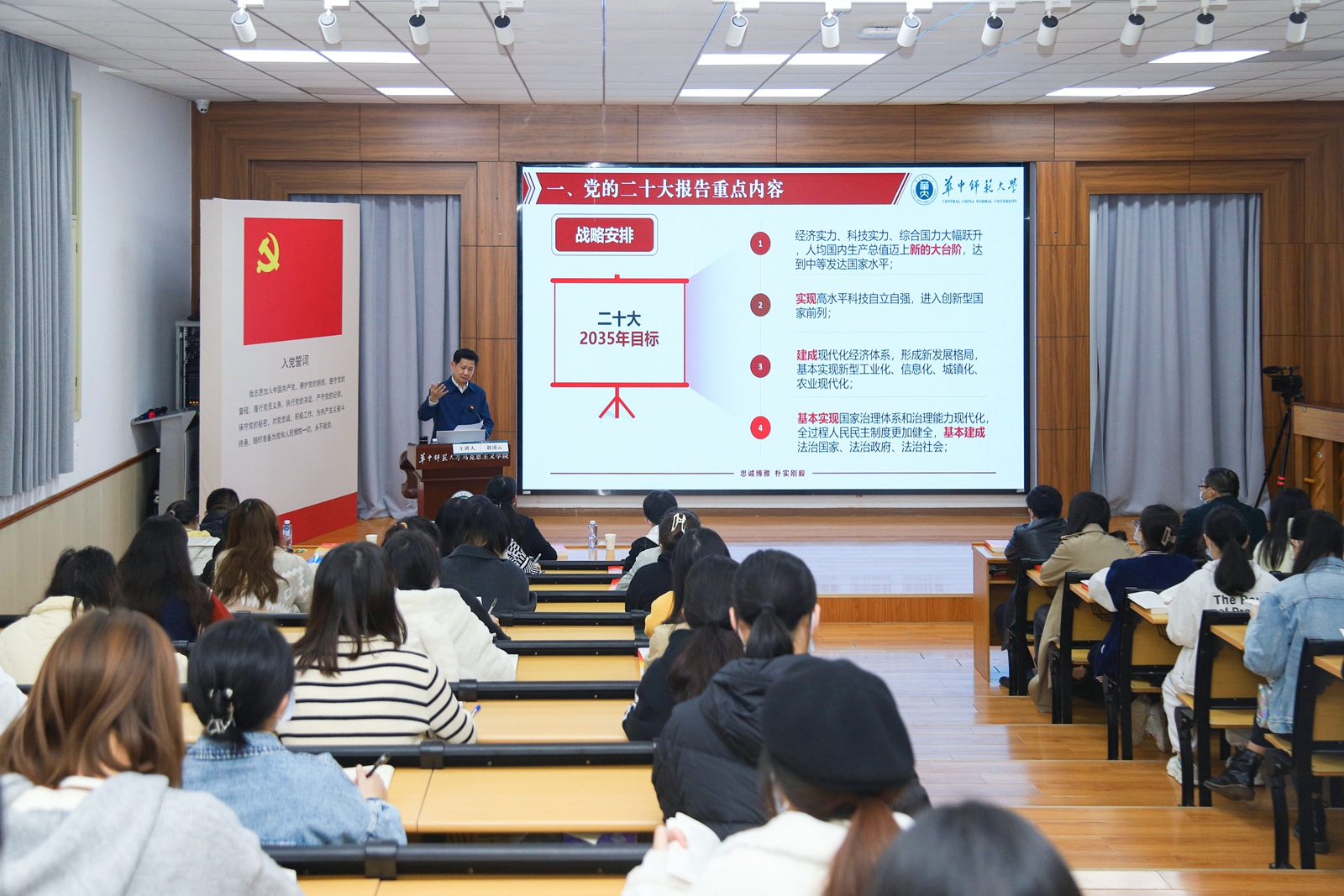 “党的二十大报告是指引中国未来发展、决定未来形势与政策的纲领性文件。”赵凌云从“举旗定向,高举中国特色社会主义伟大旗帜,全面贯彻习近平新时代中国特色社会主义思想”“道路选择,以中国式现代化全面推进中华民族伟大复兴”“战略安排,全面建设社会主义现代化国家”三个层面,为同学们导学了二十大报告的重点内容。