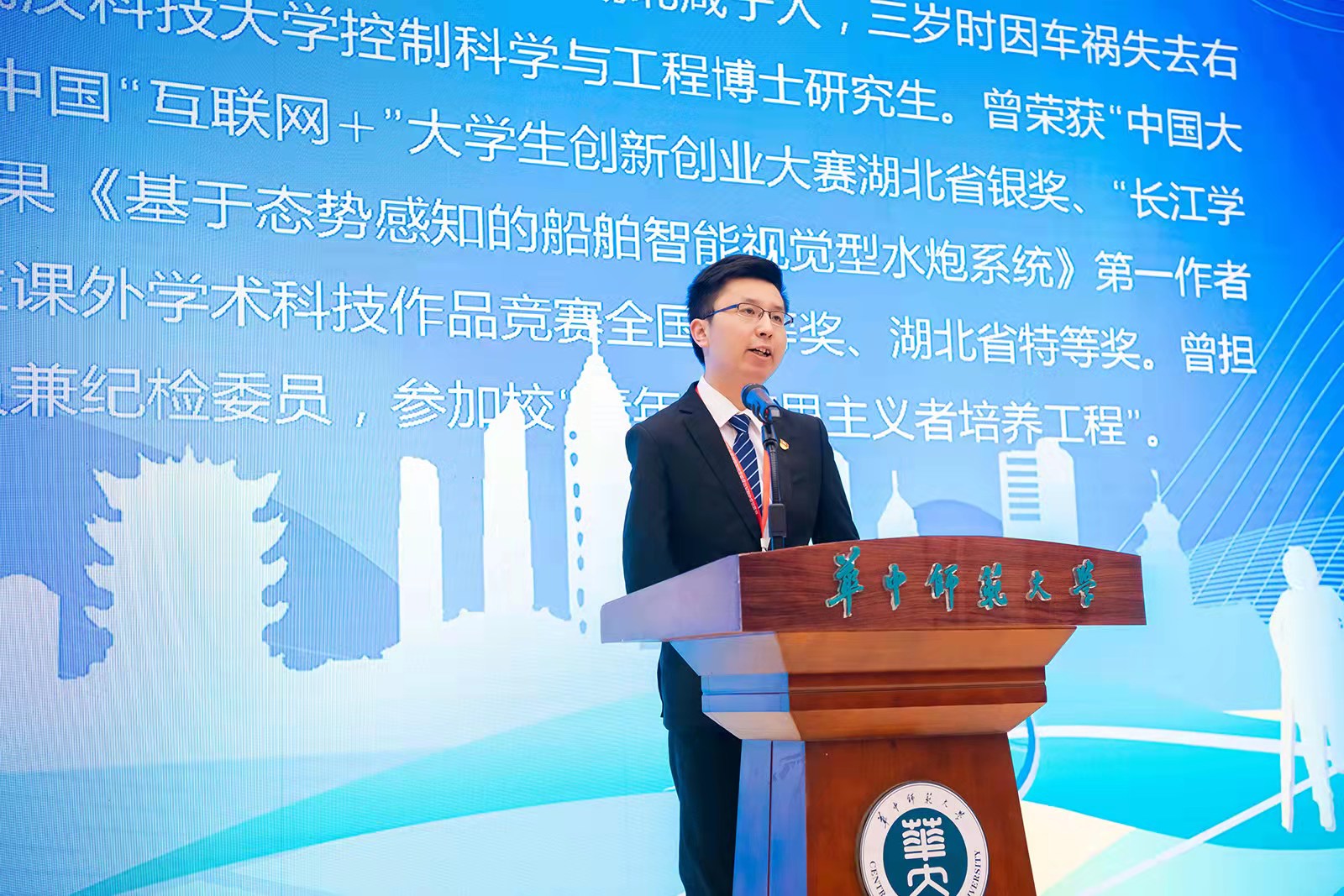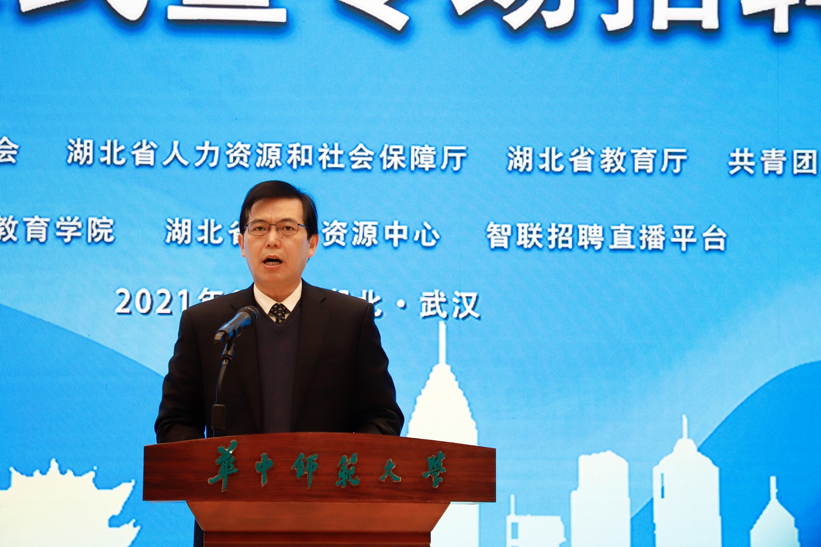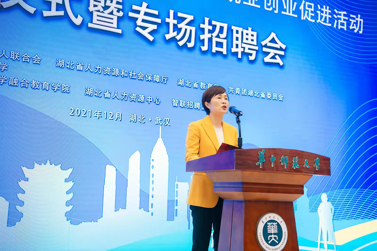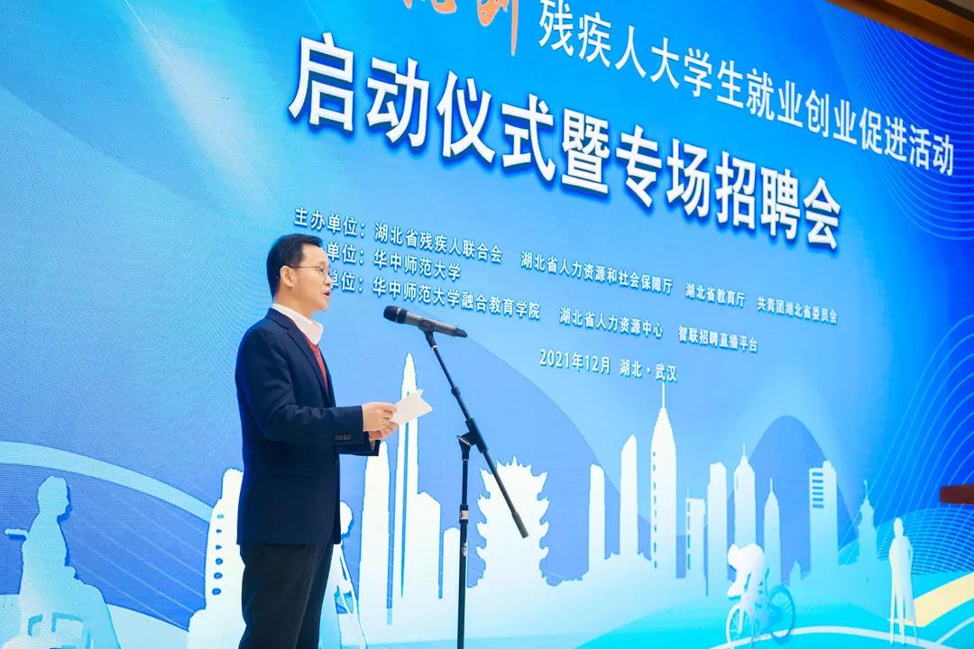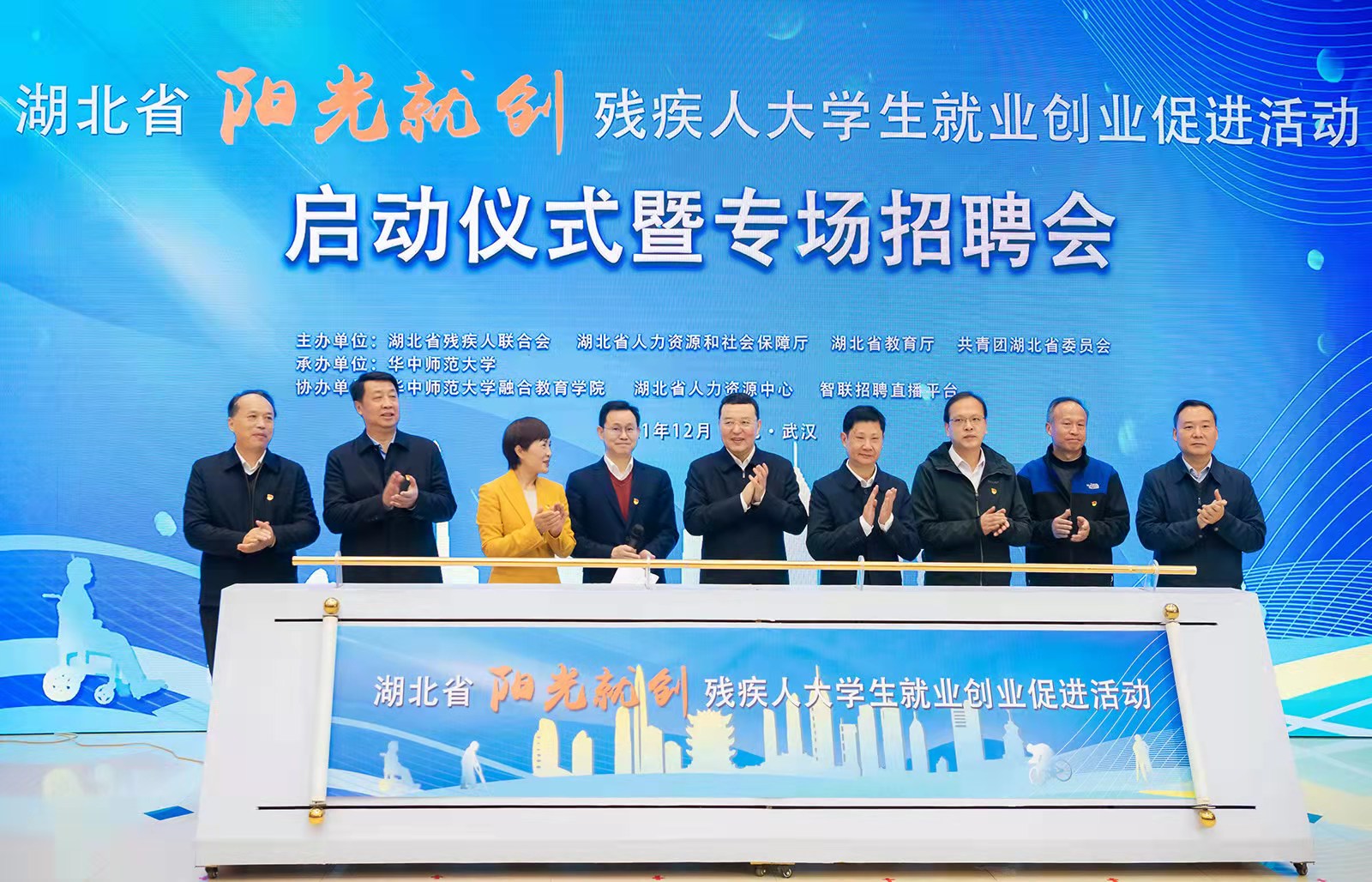 华大在线讯(记者 洪弋乔 见习记者 王丽婧)在“一二三”世界残疾人日到来之际,为推动残疾人更加充分、更高质量就业,12月2日,湖北省“阳光就创”残疾人大学生就业创业促进活动启动仪式暨专场招聘会在我校举行。湖北省委常委、省委统战部部长尔肯江·吐拉洪出席并宣布活动启动。湖北省残联党组书记、理事长夏亚灵,校党委书记赵凌云,武钢集团有限公司党委副书记、纪委书记张先贵,副校长夏立新、校党委副书记陈迪明以及省委办公厅、省教育厅、省人社厅、省残联、团省委和我校相关单位负责人参加启动仪式。湖北省政府副秘书长陈家伟主持启动仪式。