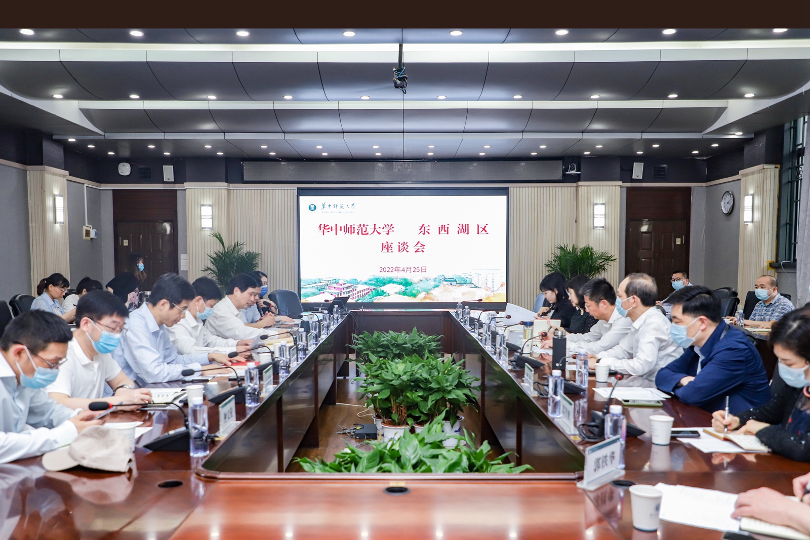 华大在线讯(见习记者 张严溢)4月25日,武汉市东西湖区委书记彭涛、武汉市教育局党委书记李超等一行来访我校,与校党委书记赵凌云、副校长任友洲在行政楼一楼会议室,就校地合作等相关事宜进行座谈。任友洲主持座谈会。