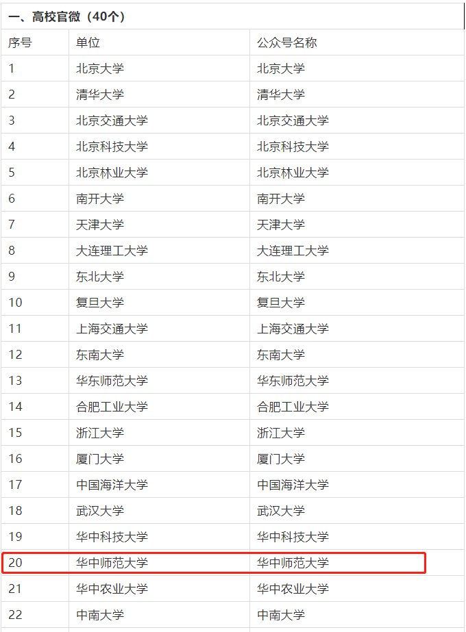 此次入选的包括清华大学、北大青年、中国大学生在线等在内的高校公众号、高校共青团公众号、知识服务类机构、全国性思政工作平台、三全育人试点区(高校、院系)、党建示范高校、党建标杆院系公众号等共12个类型、200个公众号。其中,高校官微共有40个入选,高校马克思主义学院共有16个入选。