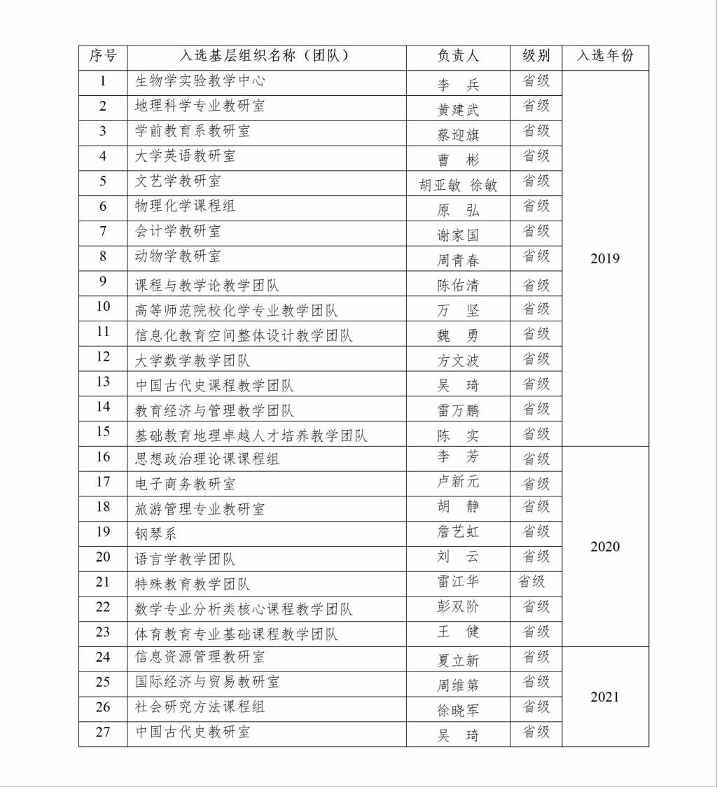 华大在线讯(通讯员 郑伦楚)近日,湖北省教育厅发布了2021年湖北高校省级优秀基层教学组织(团队)评选结果,我校信息管理学院信息资源管理教研室、经济与工商管理学院国际经济与贸易教研室、社会学院社会研究方法课程组、历史文化学院中国古代史教研室入选湖北省优秀基层教学组织。至此,自2019年湖北省启动省级优秀基层组织(团队)评选以来,我校共有16个教研室入选省级优秀基层教学组织,11个教学团队入选省级教学团队。
