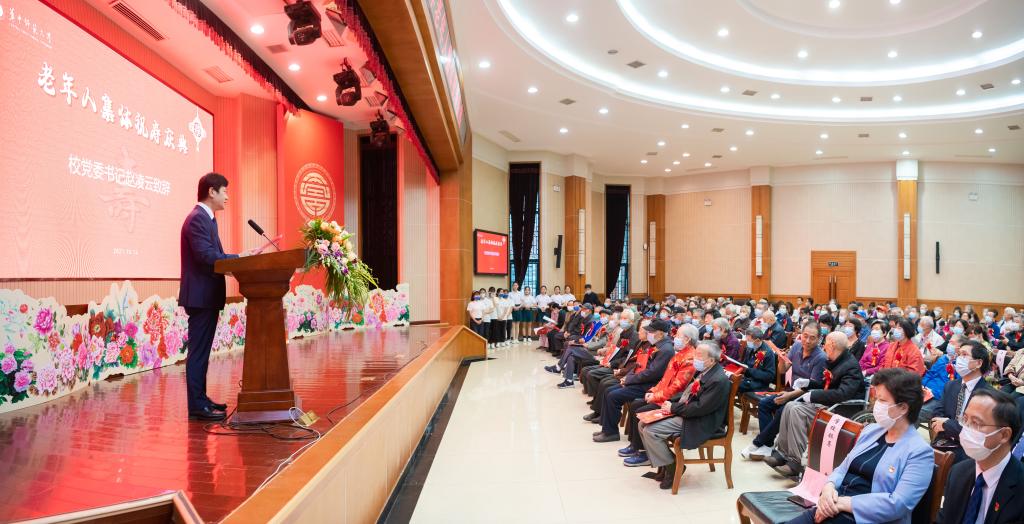 校党委书记赵凌云代表学校党委、行政,祝全体老寿星身体健康、心情愉快、福如东海、寿比南山,对全体离退休老同志为学校事业发展作出的贡献表示衷心感谢和崇高敬意。赵凌云总结了学校在落实老同志生活待遇、丰富老同志精神文化生活等方面所做的工作,同时表示将进一步提升为老服务质量、加大精准帮扶力度、创新为老服务方式、营造温馨敬老氛围,让广大老同志老有所乐、老有所为,继续为建设教师教育领先的世界一流大学发光发热。