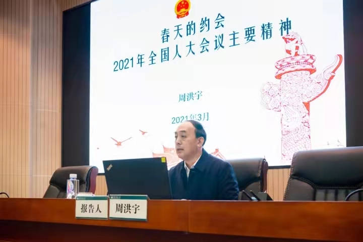 周洪宇在题为《春天的约会——2021年全国人大会议主要精神》报告中,介绍了会议概况,习近平总书记关于教育的讲话精神,政府工作报告和“十四五”规划纲要等主要精神,人大常委会、“两院”报告和全国人民代表大会组织法、全国人民代表大会议事规则、关于完善香港特别行政区选举制度的决定修改的主要精神,教育热点观察与思考,代表建言及个人履职情况等内容,并从“坚持教育公益性原则”“建设高质量教育体系”“加强师德师风建设”等方面,重点阐释了习近平总书记在“两会”期间关于教育的讲话精神,对《政府工作报告》中教育热点问题进行了解读。周洪宇表示,十三届全国人民代表大会第四次会议在中国共产党成立100周年、“十四五”开局、全面建设社会主义现代化国家新征程起步这个重要时间节点召开具有重要意义。