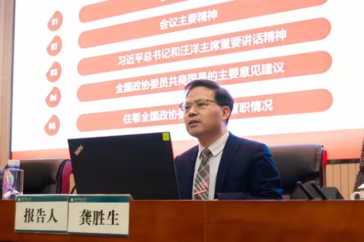 龚胜生在报告中,对第十三届全国委员会第四次会议基本情况、会议主要精神、习近平总书记和汪洋主席重要讲话精神、全国政协委员共商国是的主要意见建议、住鄂全国政协委员的履职情况等情况进行了介绍,并着重传达了习近平总书记与医疗卫生界和教育界委员座谈的重要讲话精神和汪洋主席在政协闭幕会上的讲话精神。谈及住鄂全国政协委员的履职情况,龚胜生表示,住鄂委员们以饱满的政治热情履职尽责,紧扣“十四五”开局积极建言,围绕推进长江中游城市群一体化发展、促进中部地区加快崛起、支持建设国家科技创新中心和东湖国家综合性科学中心、继续支持湖北疫后重振、加快洪湖综合治理、统筹实施引江补汉工程等重大问题提交11件重点联名提案,动情讲述夺取双胜利的湖北故事。