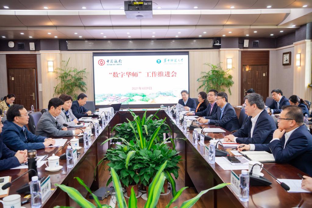 华大在线讯(通讯员 邓果)4月9日,中国银行总行郑国雨副行长、中银金科董事长邢桂伟、中国银行湖北省分行行长许伟等一行来校调研指导“数字华师”建设工作,与校党委书记赵凌云、校长郝芳华、副校长夏立新以及信息化办等相关单位负责人座谈。