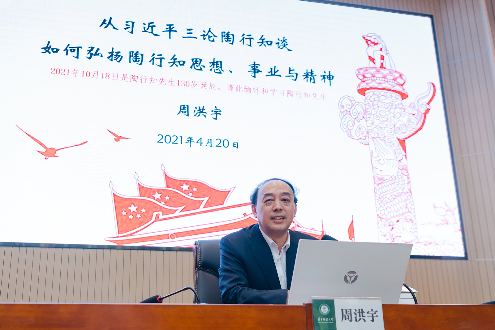 周洪宇从“陶行知是个什么样的人”“习近平总书记三论陶行知”“如何弘扬陶行知思想、事业和精神”三个方面,向师生讲述了陶行知的教育故事。周洪宇表示,我校作为全国陶行知研究的中心与重镇,成果丰硕。陶行知教育思想内涵丰富、充满智慧,要继续发扬优良研究传统,做好陶行知研究工作,探索中国教育发展道路。“习近平总书记多次引用陶行知的教育名言,号召新时代全体教师向陶行知学习,争做‘四有’教师。”周洪宇勉励同学们在理想信念、道德人格、精神品质、思想作风上,学习陶行知人民本位的政治立场和献身教育、播种未来的使命担当,学习他爱满天下的博大胸襟以及求真务实的思想作风和知行合一的实践品质。