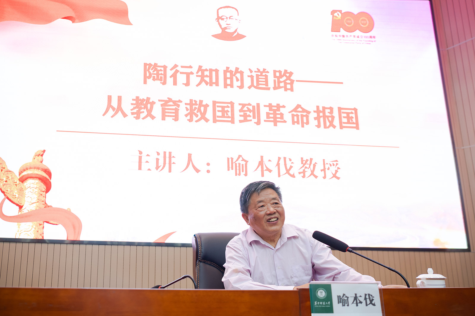 喻本伐以“陶行知的道路——从教育救国到革命报国”为题,讲述了陶行知一生中致力于建设我国教育事业、推进教育现代化的开创性贡献,为师生们上了一堂感人至深、催人奋进的思政课。“陶行知所走过的道路,也是中国近代大多数知识分子所经历的思想历程。从当时国难深重的中国,到现在繁荣富强的中国,发生了翻天覆地的巨大变化。”喻本伐希望大家能够继承和发展陶行知的思想、事业与精神,树立伟大志向,为中国的教育、中国的发展作出贡献。