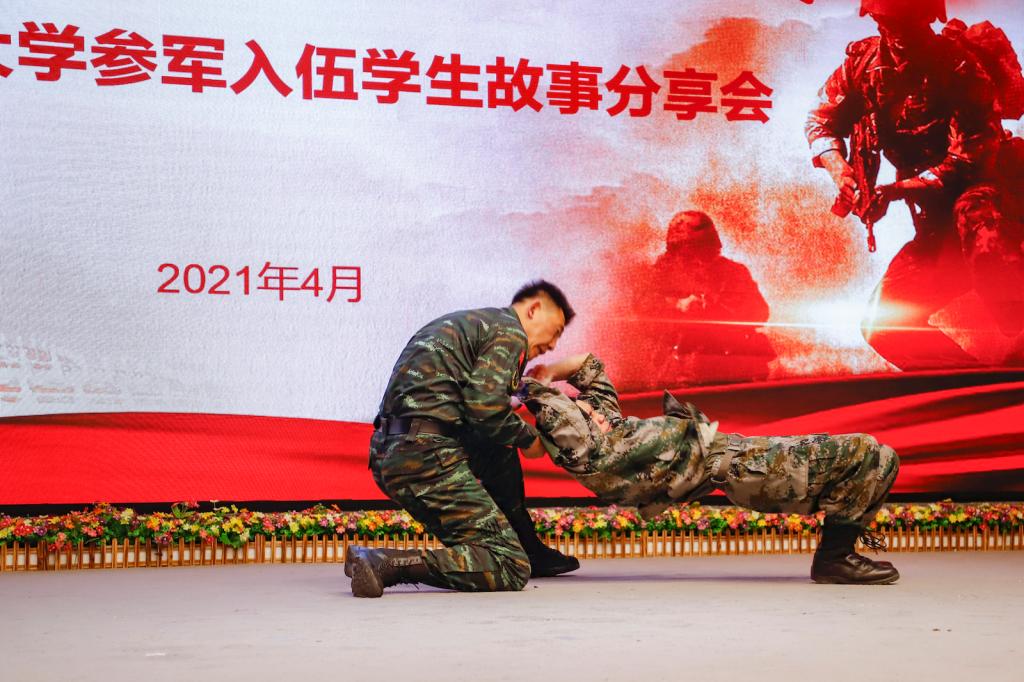 华大在线讯(记者 郝日虹)莘莘学子赴军营,绽放青春谱华章。4月27日,“携笔从戎 精忠报国”参军入伍学生故事分享会在九号楼演播厅举行。我校参军入伍学生优秀代表,与副校长彭双阶、学生工作部(人武部)等相关单位负责人、师生代表分享了他们立志从军、排除万难、报效祖国、收获成长的故事。