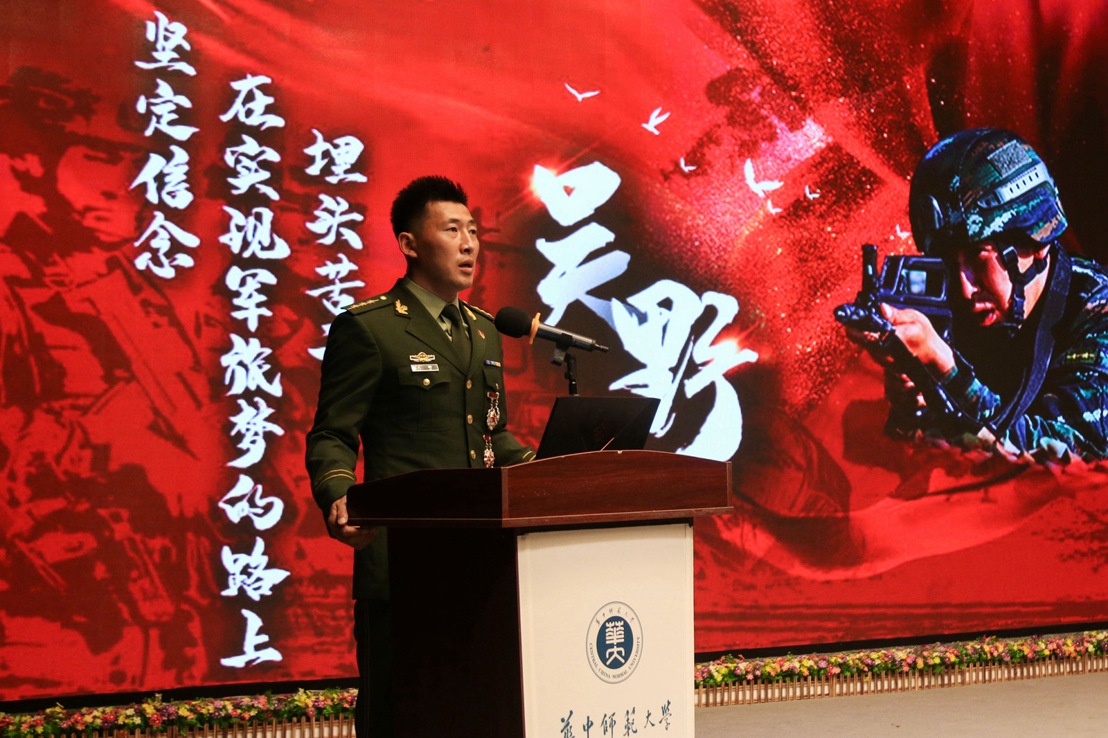 参军入伍学生代表、武警新疆总队某支队特战中队中队长、我校体育学院2008级本科生吴野入伍12年,在各级组织和首长关怀下,从一名普通的大学生士兵成长为一名武警警官,“儿时立志参军报国”的他选择为梦想拼搏,奋发图强,砥砺前行。抱定“当兵就当过硬的兵”的吴野扛住了特战分队“魔鬼周”超极限训练,收获了沉甸甸的“勇士”徽章;加入武警新疆总队某支队特战中队的他不断锤炼军事技能,把自己“锻造”成反恐维稳的尖刀和铁拳;当走上特战分队的队长岗位,他带领中队全体官兵完成上级赋予的各项任务。“忠诚博雅、朴实刚毅”的华师精神依然鞭策我前进。”吴野坚定承诺,愿为国防建设奉献出全部力量。