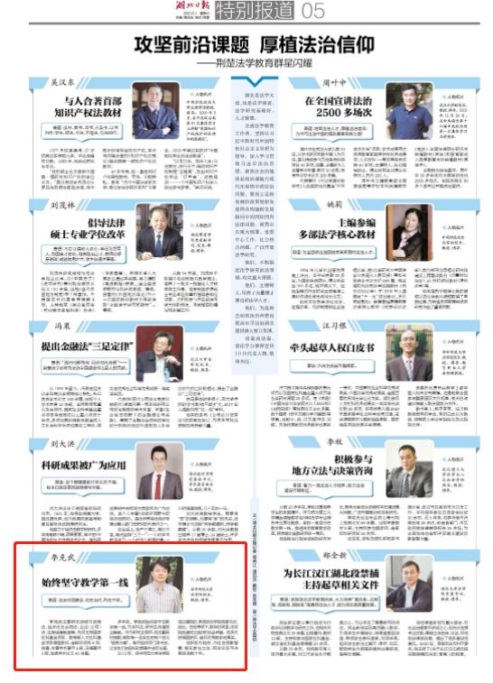 编者按:5月1日《湖北日报》(第五版)特别报道“攻坚前沿课题 厚植法治信仰——荆楚法学教育群星闪耀”专栏,整版报道全省法学教育工作者,湖北省委政法委、湖北省法学会推荐宣传10位代表人物,我校法学院院长李克武教授位列其中。具体报道内容转载如下:
